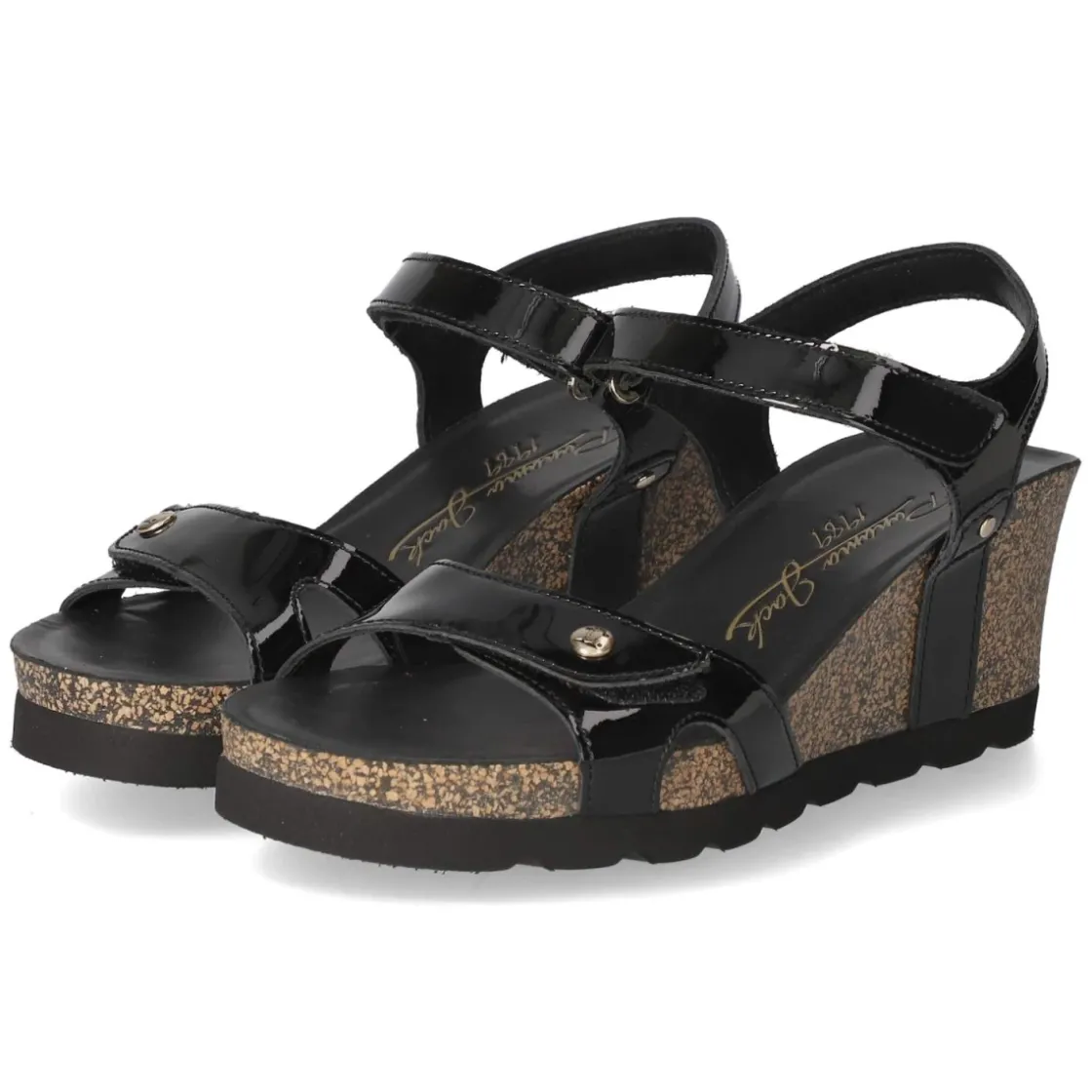 Die Sandaletten JULIA von Panama Jack setzen auf eine elegante Lackoptik in tiefem Schwarz und verbinden Komfort mit dezenter Raffinesse. Das Obermaterial aus Lackleder strahlt edel, während der 6 cm hohe Keilabsatz für eine angenehme, alltagstaugliche Höhe sorgt. Zwei praktische Klettverschlüsse ermöglichen eine individuell regulierbare Passform, die normal ausfällt, und werden von goldfarbenen Markendetails stilvoll akzentuiert. Eine weich gepolsterte Lederdecksohle und das komfortable Fußbett bieten spürbare Entlastung, die rund zulaufende Spitze gewährt entspanntes Abrollen. Die rutschhemmende Laufsohle vermittelt Stabilität auf verschiedensten Untergründen. So wird JULIA zum vielseitigen Favoriten für City, Office und Dinner. Modetipp: Zu einer fließenden Culotte und einem schlichten Top entsteht ein moderner, edler Look; feiner Goldschmuck greift die Metallakzente harmonisch auf.