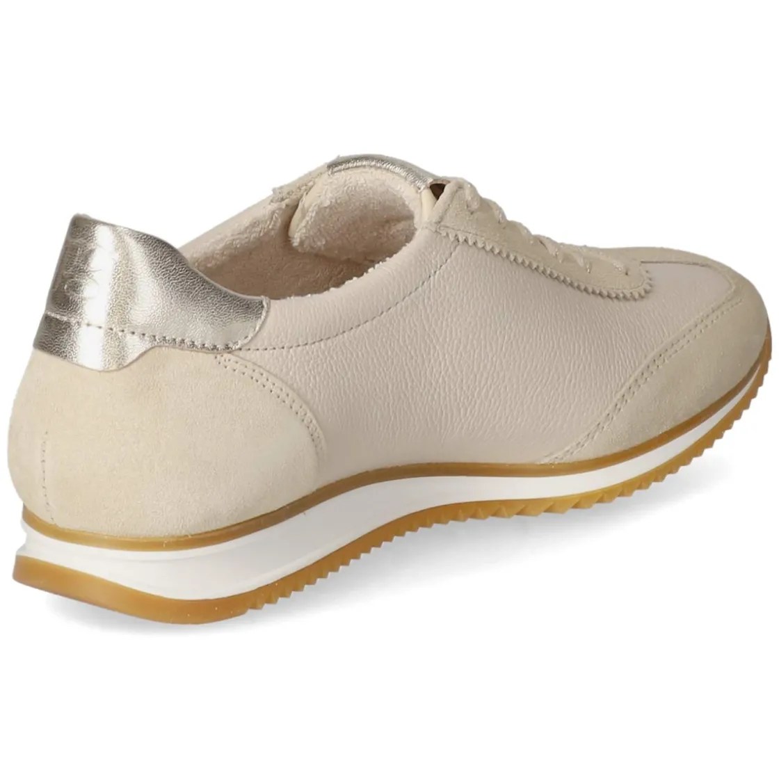 Der Low Sneaker von Paul Green verbindet sportive Leichtigkeit mit eleganter Zurückhaltung. Das beige Obermaterial aus Leder und Textil wirkt hochwertig, während atmungsaktives Echtleder für ein ausgeglichenes Fußklima sorgt. Die hautfreundliche Lederdecksohle und das gepolsterte, vorgeformte Lederfußbett unterstützen den Fuß angenehm bei jedem Schritt. Dank runder Spitze bleibt Zehenfreiheit erhalten, die Schnürung ermöglicht eine präzise Anpassung. Goldfarbene Akzente mit dezenten Markendetails setzen edle Highlights. Ein verstärkter Zehen- und Fersenbereich stabilisiert, der gepolsterte Einstieg erhöht den Komfort. Die flexible, rutschhemmende Laufsohle gewährleistet sicheren Halt im Alltag. Der Schnitt fällt normal aus und macht die Passform unkompliziert. Modetipp: Zu Cropped-Jeans, einem karamellfarbenen Trench und feinen Goldketten entfaltet der Sneaker seinen cleanen City-Chic.