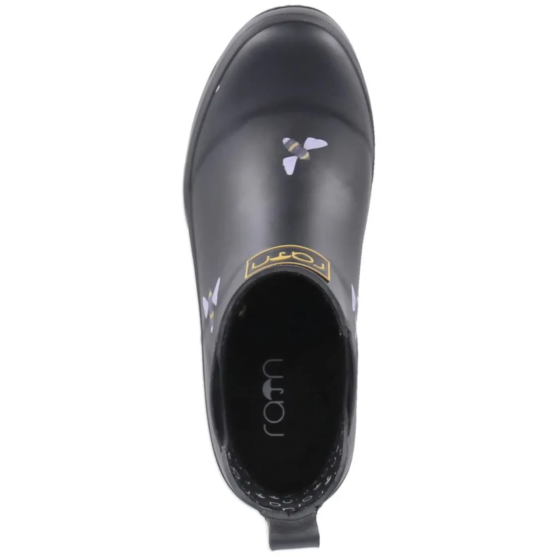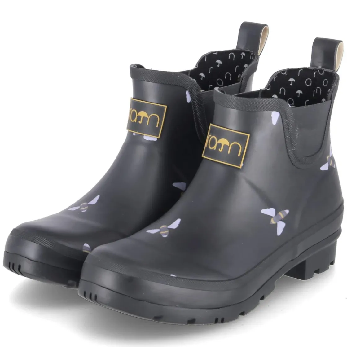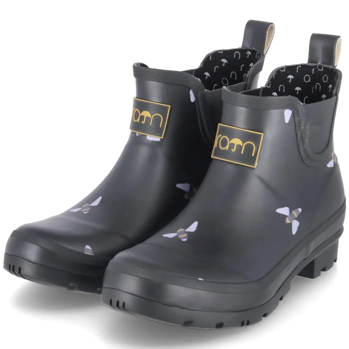 Der Chelsea Boot BEE von Rajn in klassischem Schwarz verbindet urbanes Design mit wettertauglicher Funktion. Das Obermaterial aus Gummi hält Feuchtigkeit zuverlässig ab, die seitlichen Elastikeinsätze und die Anziehlasche sorgen für einen unkomplizierten Einstieg. Mit rund zulaufender Spitze, blockigem 3 cm Absatz und verstärktem Fußrahmen steht das Modell für Stabilität im Alltag. Das gepolsterte, herausnehmbare Wechselfußbett auf textiler Decksohle bietet angenehme Dämpfung und lässt sich bei Bedarf gegen eigene Einlagen tauschen. Reflektierende Details inklusive Fersenstreifen erhöhen die Sichtbarkeit bei Dämmerung, während die flexible, rutschhemmende Profilsohle sicheren Halt gibt. Der dezente Bienenprint setzt einen charaktervollen Akzent, der das moderne Erscheinungsbild abrundet. Modetipp: In Kombination mit gerader Cropped-Jeans und einem oversized Wollmantel entsteht ein cleaner City-Look.