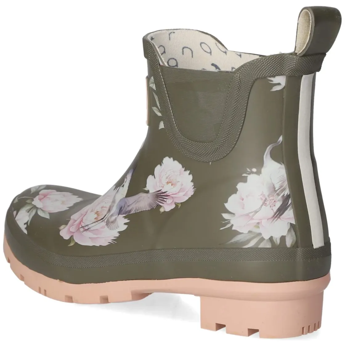 Der Gummistiefel PEONY von Rajn bringt Farbe in graue Tage: sattes Grün trifft auf ein geblümtes Dessin mit anmutigen Kranichen und ein dezentes Markenemblem. Das wasserfeste Gummi-Obermaterial mit verstärkter Ferse schützt zuverlässig vor Nässe, während die reflektierende Ferse für zusätzliche Sichtbarkeit sorgt. Ein 3 cm hoher Blockabsatz und die flexible, rutschhemmende Laufsohle geben stabilen Halt auf glatten Wegen. Innen punktet leichtes Textilfutter mit gepolsterter Wechseldecksohle; das komfortable Wechselfußbett lässt sich bei Bedarf austauschen. Der unkomplizierte Einstieg ohne Verschluss gelingt dank praktischer Anziehlasche im Handumdrehen. Der Schuh fällt größengetreu aus und eignet sich für Erwachsene, die Funktion mit verspieltem Look verbinden möchten. Modetipp: Zu knöchellanger Straight-Jeans und einem wachsversiegelten Parka setzt das florale Muster einen frischen Kontrast; dazu grob gestrickte Socken leicht über den Schaft blitzen lassen.