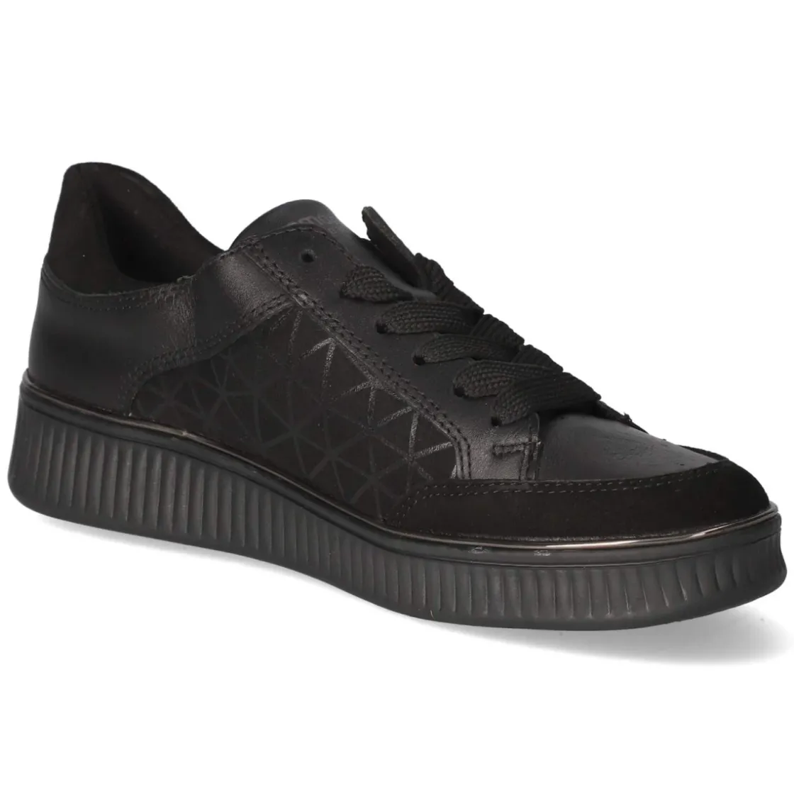 Der Low Sneaker von Remonte verbindet urbanen Chic mit funktionaler Bequemlichkeit. Schwarzes Glattleder aus atmungsaktivem Echtleder legt sich weich an und wird durch verstärkte Zonen aus Rauleder an Zehen und Ferse robust ergänzt. Schnürung und zusätzlicher Reißverschluss ermöglichen einen schnellen Einstieg und eine passgenaue Weitenregulierung. Der rund gearbeitete Leisten, ein bequem gepolsterter Einstieg sowie die gepolsterte, herausnehmbare Textil-Decksohle sorgen für langanhaltenden Komfort. Optisch setzen geometrische Partien und der platinfarbene Schuhrahmen moderne Akzente, während die flexible, rutschhemmende Laufsohle sicheren Grip bietet. Der Größenhinweis fällt kleiner aus, daher wird eine Nummer größer empfohlen. Modetipp: Zu Cropped-Jeans und einem cleanen Blazer entfaltet der metallische Rahmen seine Wirkung; silberne Accessoires greifen die Nuance elegant auf.
