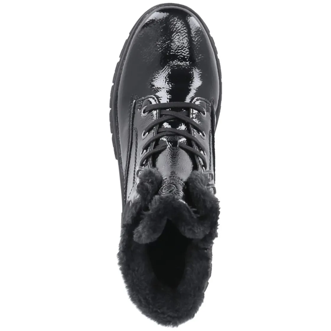 Diese Winterstiefeletten von Remonte verbinden zuverlässigen Wetterschutz mit hohem Tragekomfort. Das Obermaterial aus Leder und Textil ist wasserfest und zugleich atmungsaktiv, der runde Leisten sorgt für angenehme Zehenfreiheit. Schnürung und zusätzlicher Reißverschluss erleichtern den Einstieg, während der gepolsterte Schaft mit Kunstfellkragen weich umschließt. Ein warmes Wollfutter hält an kalten Tagen die Füße behaglich, die textile Decksohle und das herausnehmbare Wechselfußbett bieten bequemes Fußklima und die Möglichkeit individueller Einlagen. Stabilität bringt der verstärkte Fersenbereich, die robuste, rutschhemmende Profilsohle gibt verlässlichen Grip auf nassem Asphalt. Dezente Ziernähte setzen Akzente zur schwarzen Farbe. Die Passform fällt normal aus. Modetipp: Mit Wollmantel, Strickkleid und blickdichter Thermostrumpfhose entsteht ein citytauglicher Winterlook mit sportiver Note.