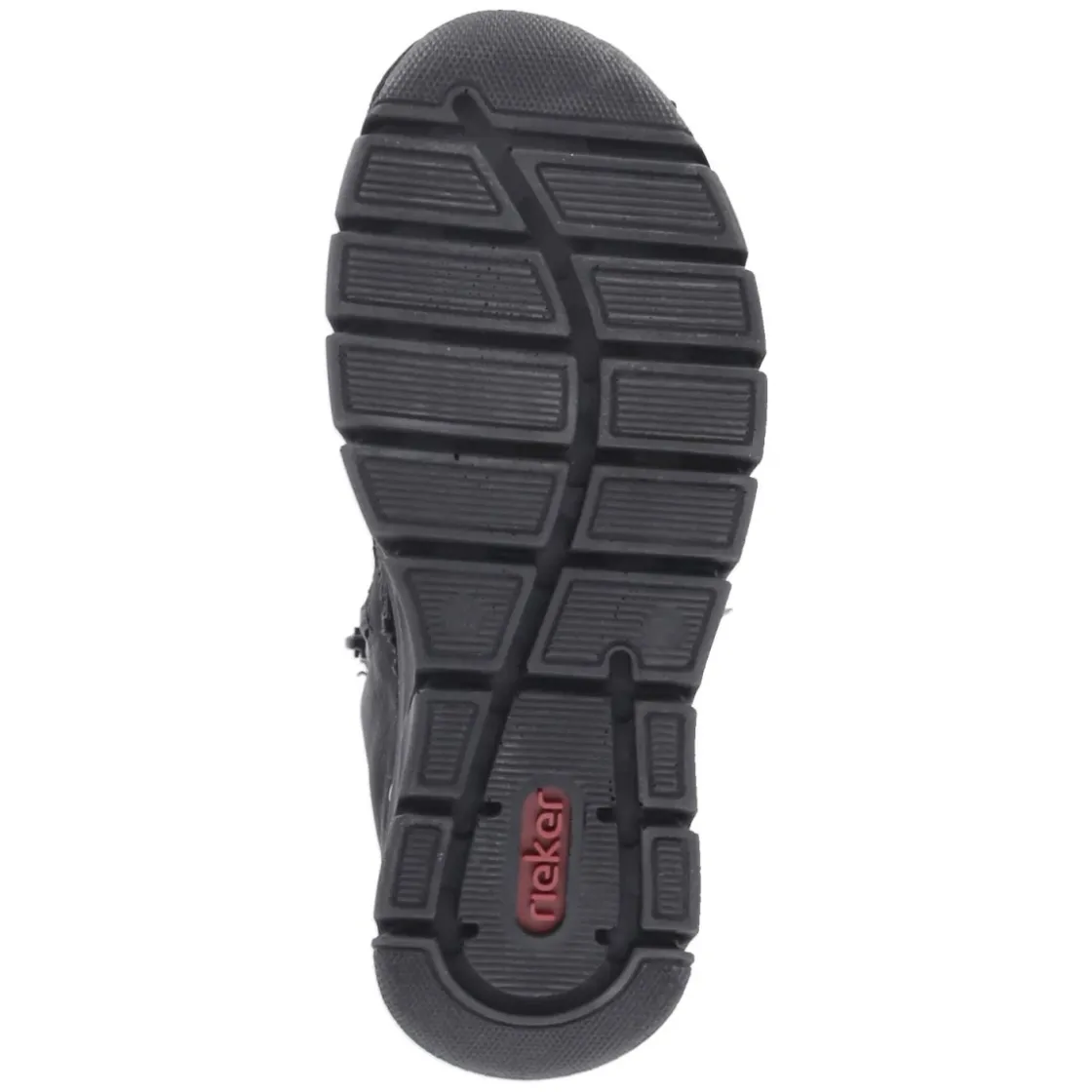 Der schwarze Damen-Boot von Rieker vereint wintertaugliche Wärme mit entspanntem Tragegefühl. Das pflegeleichte Synthetik-Obermaterial zeigt eine klare Linienführung, ergänzt durch einen Zierreißverschluss am Schaft, während die runde Spitze und der verstärkte Fersen- und Zehenbereich Alltagstauglichkeit unterstreichen. Warmfutter mit weichem Teddyfutter umschließt den Fuß, die Textil-Decksohle und das gepolsterte Fußbett sorgen für anhaltenden Komfort. Dank relaxtem Leichtgewicht und flexibler, rutschfester Laufsohle bleibt jeder Schritt angenehm und sicher. Der praktische Mix aus Schnürsenkeln und seitlichem Reißverschluss erleichtert den Einstieg, eine Anziehlasche unterstützt zusätzlich. Die Passform fällt normal aus, wodurch unkomplizierte Größenauswahl gelingt. Modetipp: Eine Kombination mit schwarzer Strumpfhose, Midirock in Wolloptik und Oversize-Strick schafft einen lässig-warmen City-Look.