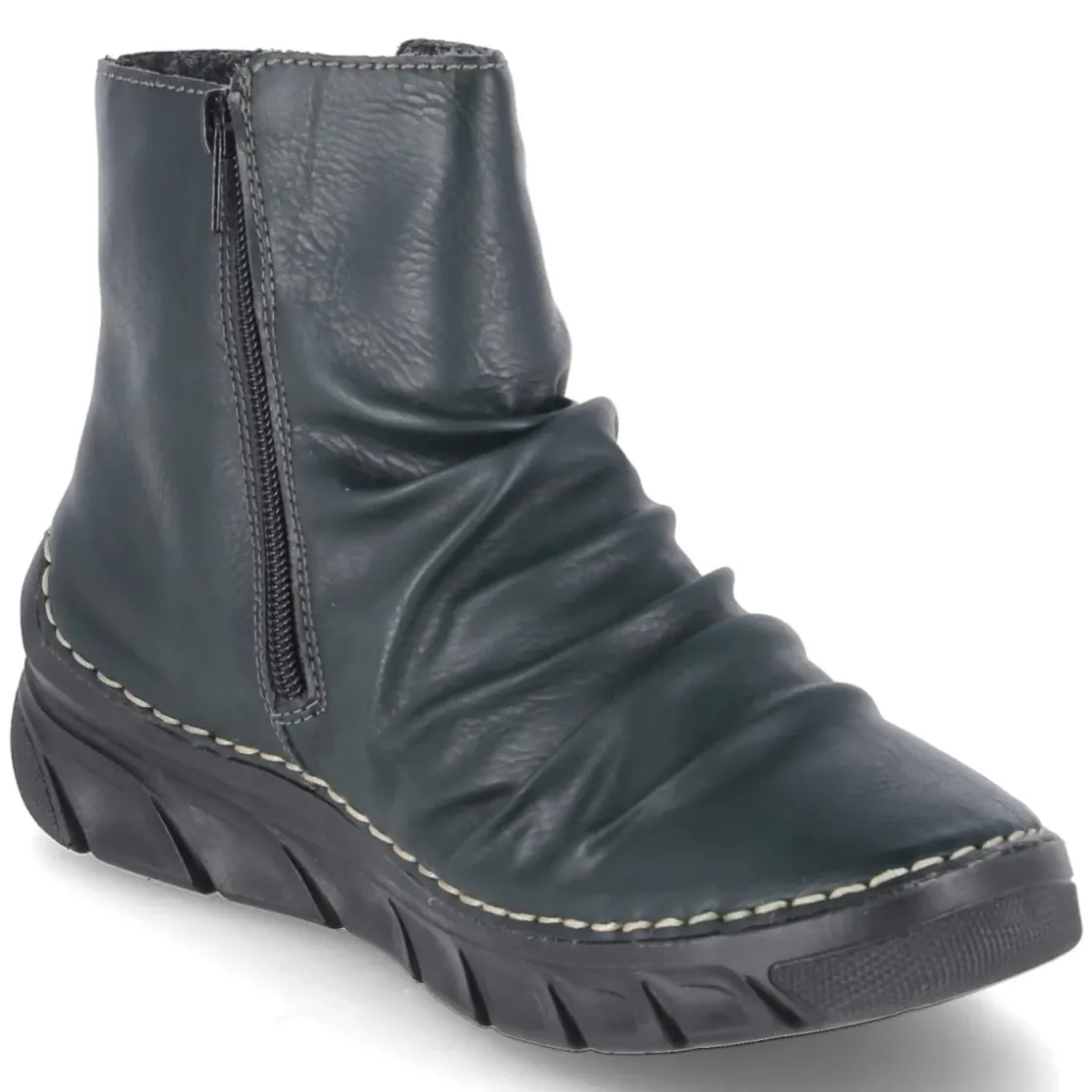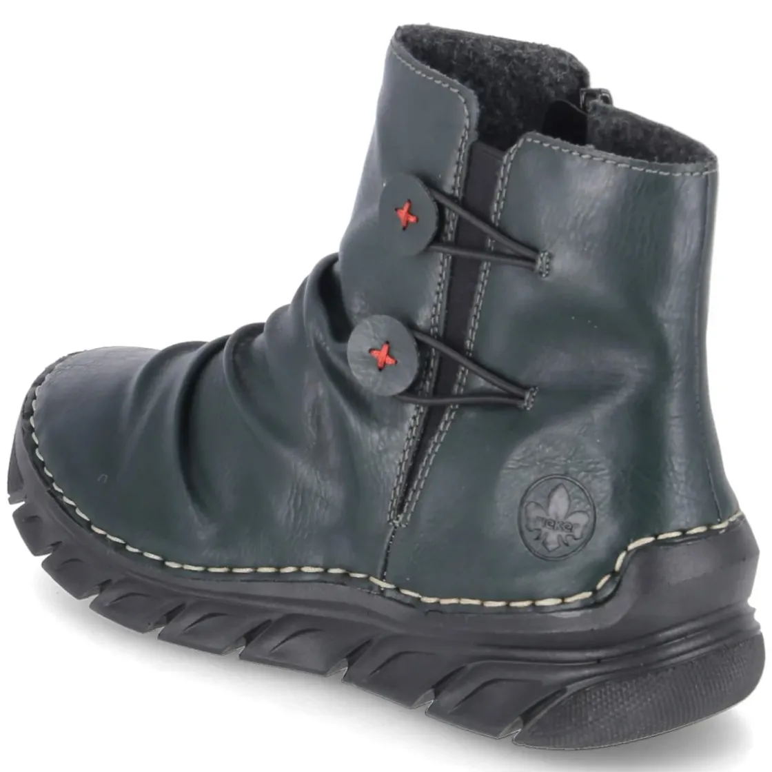 Dieser grüne Damen-Boot von Rieker verbindet urbanen Charme mit alltagstauglichem Komfort. Das pflegeleichte Kunstleder-Obermaterial zeigt sich unempfindlich im täglichen Einsatz und überzeugt mit ruhiger, fein genarbter Optik. Ein bequemer Reißverschlusseinstieg erleichtert das An- und Ausziehen, während die runde Schuhspitze entspannt Platz bietet. Innen sorgt ein leichtes Futter für wohltemperierte Füße an kühlen Tagen, die Textil-Decksohle unterstützt angenehm bei jedem Schritt. Der Passformhinweis fällt normal aus und macht die Größenauswahl unkompliziert. Das Rieker-Design setzt auf zurückhaltende Details, wodurch der kräftige Grünton elegant zur Geltung kommt und vielseitig kombinierbar bleibt. Modetipp: Zu gerader Cropped-Jeans, cremefarbenem Strick und Mantel in Karamell entsteht ein harmonischer Kontrast, der das Grün leuchten lässt.