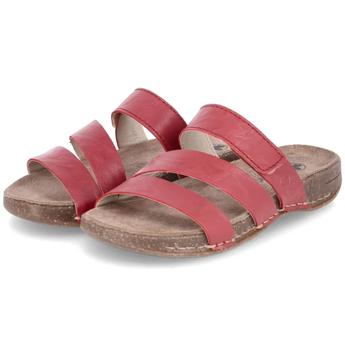 Rote Pantoletten von Rieker vereinen sommerliche Leichtigkeit mit wertiger Verarbeitung. Das Obermaterial aus Glattleder zeigt sich strapazierfähig und formschön, während langlebiges Echtleder den Anspruch an Qualität unterstreicht. Eine offene Schuhspitze sorgt für Luftigkeit, die flexible, griffige Laufsohle gibt verlässlichen Halt auf verschiedenen Untergründen. Für anhaltenden Komfort steht das vorgeformte, gepolsterte Lederfußbett, das den Fuß angenehm unterstützt. Der bequeme Klettverschluss erlaubt eine individuelle Weitenregulierung und macht das An- und Ausziehen unkompliziert. Die Passform fällt normal aus und richtet sich an Damen, die ein unkompliziertes, alltagstaugliches Sommermodell bevorzugen. Modetipp: Rot wirkt besonders edel zu hellen Leinenstoffen und sanften Naturtönen, etwa mit einer cremefarbenen Culotte und einer lockeren Bluse aus Viskose, dazu dezenter Goldschmuck für einen modernen, entspannten City-Look.