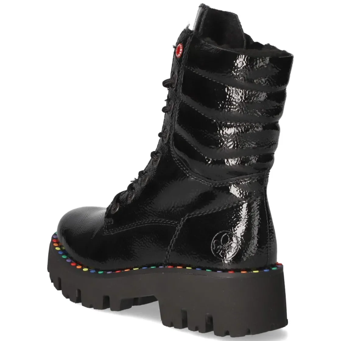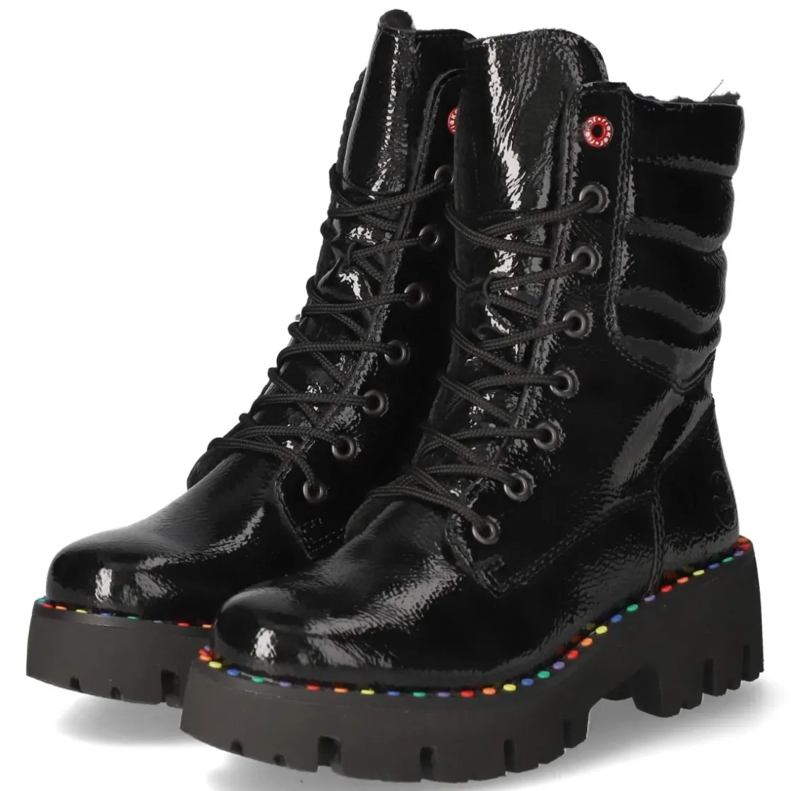 Diese Rieker Schnürstiefeletten vereinen eine elegante Lackoptik mit funktionalen Details für die kalte Saison. Das Obermaterial in tiefem Schwarz bringt Glanz in den Look, während die runde Schuhspitze und die angenehm gepolsterte Textildecksohle komfortable Schritte ermöglichen. Ein 5 cm hoher Plateauabsatz verleiht subtilen Höhengewinn und sorgt für einen modernen Auftritt. Das warme Futter umhüllt zuverlässig an kühlen Tagen, der praktische Mix aus Schnürsenkeln und seitlichem Reißverschluss erleichtert das An- und Ausziehen. Die Passform fällt normal aus und eignet sich für vielfältige Anlässe – von City-Styles bis zu besonderen Events. Modetipp: In Kombination mit einer blickdichten Strumpfhose, einem Midirock aus Satin und einem strukturierten Strickpullover entsteht ein spannender Kontrast zwischen Glanz und Weichheit, der das edle Finish der Stiefelette betont.