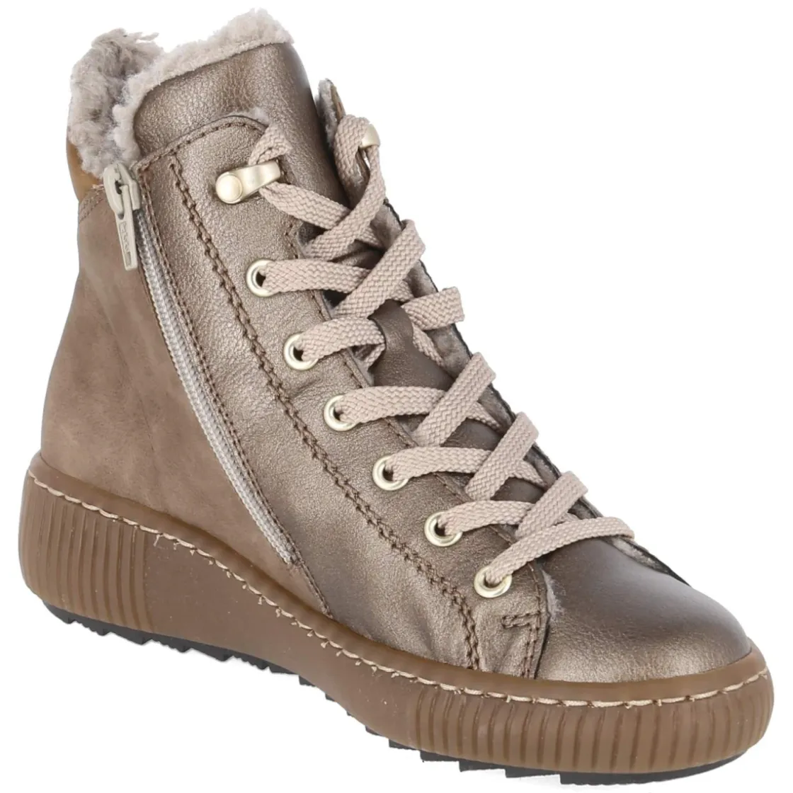Bronzefarbene Schnürstiefeletten von Rieker setzen mit feinem Metallic-Schimmer ein edles Statement im Alltag. Das Obermaterial aus Kunstleder zeigt sich besonders pflegeleicht, während Warmfutter und Textil-Decksohle angenehm durch kühlere Tage tragen. Die Kombination aus Schnürsenkeln und praktischem Reißverschluss sorgt für eine individuell anliegende Passform und schnellen Einstieg, unterstützt von einem weich gepolsterten Schaft. Als relaxtes Leichtgewicht mit runder Spitze überzeugt das Modell zudem mit einer flexiblen, griffigen Laufsohle für zuverlässigen Halt auf wechselnden Untergründen. Die Passform fällt normal aus und passt damit mühelos in die gewohnte Größe. Modetipp: Zu Straight-Leg-Jeans, einem grob gestrickten Cardigan und einer strukturierten Umhängetasche kommt der bronzene Glanz besonders harmonisch zur Geltung.
