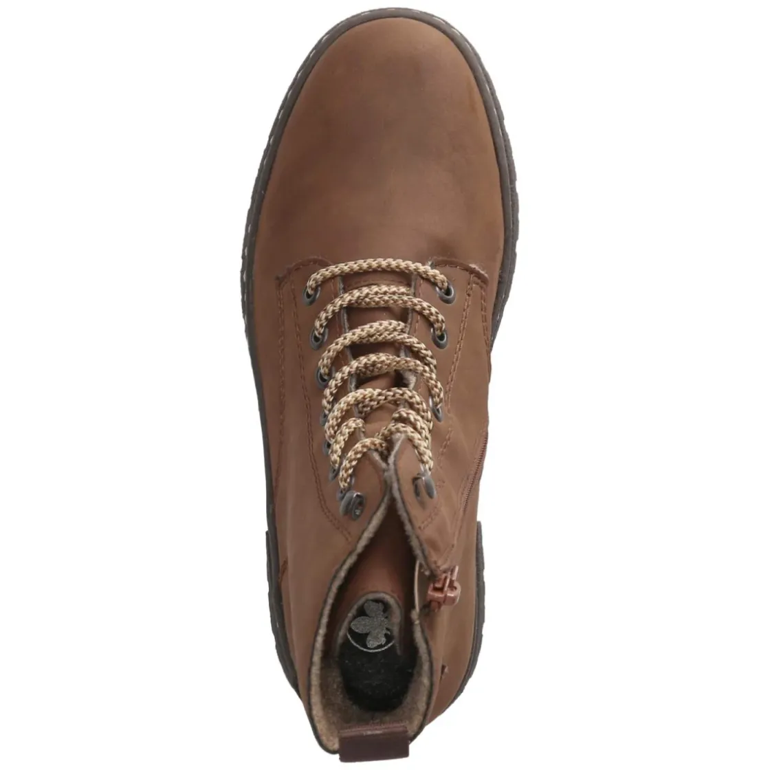 Die braunen Schnürstiefeletten von Rieker verbinden urbanen Stil mit verlässlichem Komfort. Das modern designte Synthetik-Obermaterial zeigt eine gepflegte Optik und wird durch rustikale Ziernähte sowie einen Zierstreifen mit Markenschriftzug akzentuiert. Innen sorgt ein weiches Filzfutter zusammen mit der textilen Decksohle für angenehme Wärme, während das gepolsterte Fußbett Entlastung bei jedem Schritt bietet. Dank Schnürsenkeln und zusätzlichem Reißverschluss gelingt das An- und Ausziehen mühelos; eine Anziehlasche unterstützt zusätzlich. Die runde Schuhspitze schafft Zehenfreiheit, die flexible und rutschfeste Laufsohle gibt Halt auf wechselnden Untergründen. Das Modell fällt größengetreu aus und eignet sich für den Alltag ebenso wie für Wochenendpläne. Modetipp: Zu Cropped-Denim und einem kastigen Wollmantel tragen; ein grober Strickschal in Naturtönen nimmt das Braun harmonisch auf.