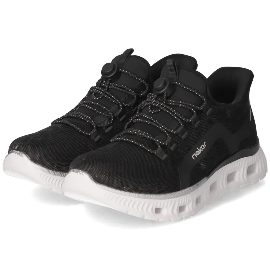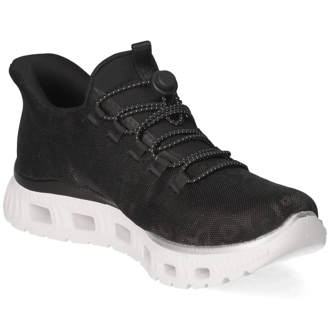 Der Slip on Sneaker von Rieker in tiefem Schwarz verbindet sportliche Leichtigkeit mit urbanem Chic. Das leichte Obermaterial aus Textil und Synthetik schmiegt sich angenehm an den Fuß, während die runde Schuhspitze und das gepolsterte Fußbett für entspanntes Tragegefühl im Alltag sorgen. Dank flexiblem Schnellverschluss und Anziehlasche gelingt das Hineinschlüpfen im Handumdrehen, die flexible, rutschhemmende Laufsohle liefert zuverlässigen Grip. Glänzende Akzente und eine dezente Animaloptik setzen subtile Highlights, Markendetails runden den Look ab. Die Passform fällt normal aus, die textile Decksohle erhöht den Komfort auch bei längeren Wegen. Ein vielseitiger Damen-Sneaker, der Büro, City und Freizeit mühelos verbindet. Modetipp: Mit verkürzter Straight-Jeans und Oversize-Blazer entsteht ein smarter Kontrast, monochrom in Schwarz mit silbernen Accessoires wirkt der Look besonders modern.