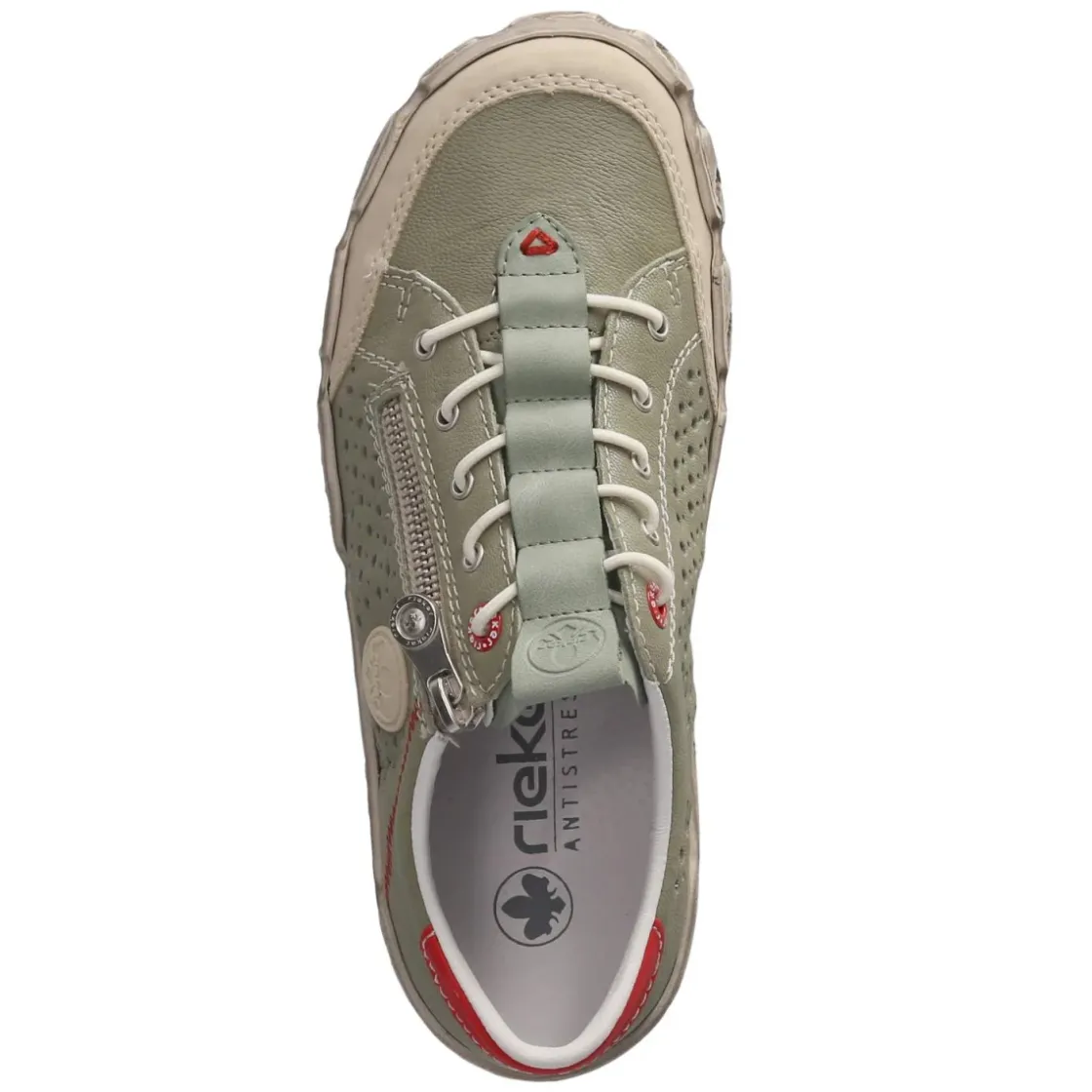 Dieser Rieker Slipper in frischem Grün verbindet Leichtigkeit mit durchdachtem Komfort. Das Obermaterial aus Leder und Synthetik zeigt eine gelochte Struktur mit seitlicher Lochung in beige, die für angenehme Luftzirkulation sorgt und den Look elegant akzentuiert. Ein praktischer Reißverschluss erleichtert das An- und Ausziehen, während ein Elastikband in Schnüroptik die sportive Note unterstreicht. Das geringe Gewicht, der leicht gepolsterte Einstieg und das weich gepolsterte Fußbett mit Decksohle aus Leder bieten entspanntes Gehen über den ganzen Tag. Die flexible Laufsohle im Used Look bringt urbanen Charakter, der verstärkte Zehenbereich und dezente rote Details runden das Design ab. Mit runder Schuhspitze und normaler Passform wird zeitloser Stil alltagstauglich. Modetipp: Zu hellen Leinenhosen und einem cremefarbenen Shirt entsteht ein lässiger Sommer-Look.
