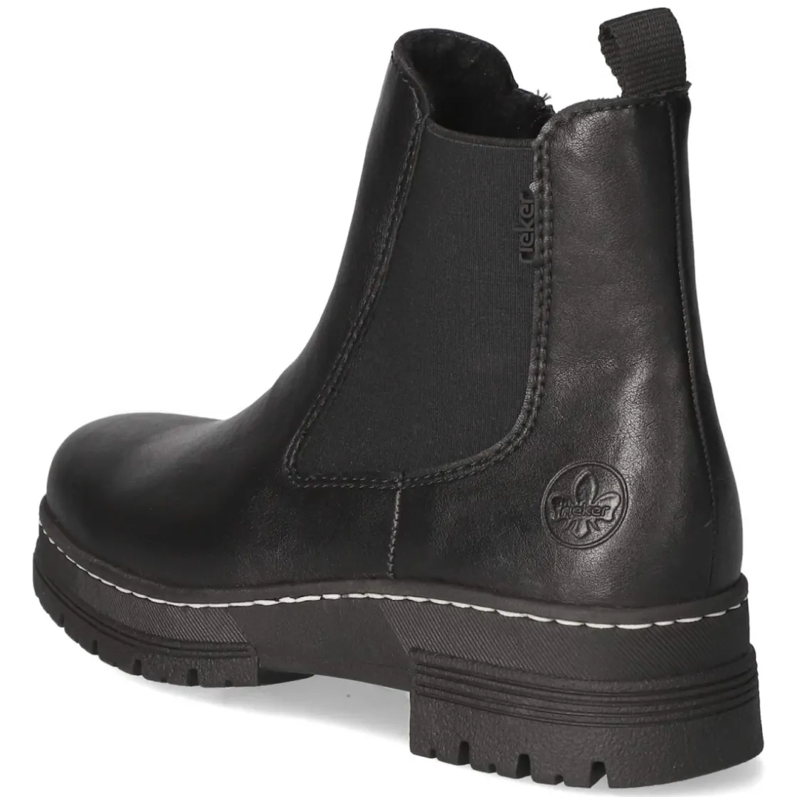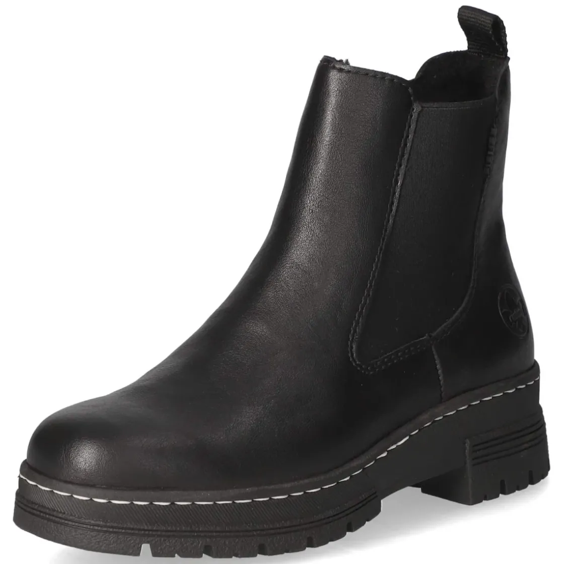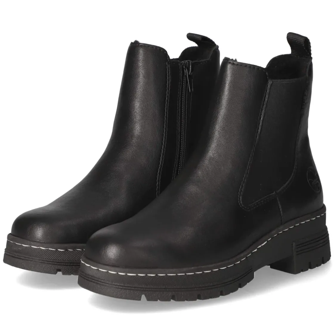 Diese schwarzen Rieker-Stiefeletten verbinden wintertauglichen Komfort mit zeitlosem Design. Das pflegeleichte Kunstleder zeigt eine feine Struktur, betont durch Ziernähte, Markendetails und eine rustikale, weiße Sohlennaht. Die runde Spitze und der 4-cm-Blockabsatz geben dem Fuß natürliche Freiheit und stabilen Halt. Innen sorgt Warmfutter für behagliche Temperaturen, während das gepolsterte Wechselfußbett und die flexible, rutschhemmende Laufsohle für langanhaltenden Gehkomfort stehen. Reißverschluss und Anziehlasche erleichtern den Einstieg, der Elastikeinsatz am Schaft optimiert den Sitz. Die Passform fällt normal aus und macht das Modell zum unkomplizierten Begleiter im Alltag. Modetipp: Perfekt zu Strickkleid und dicker Strumpfhose, abgerundet mit einem Oversize-Mantel für einen modernen Winter-Look.