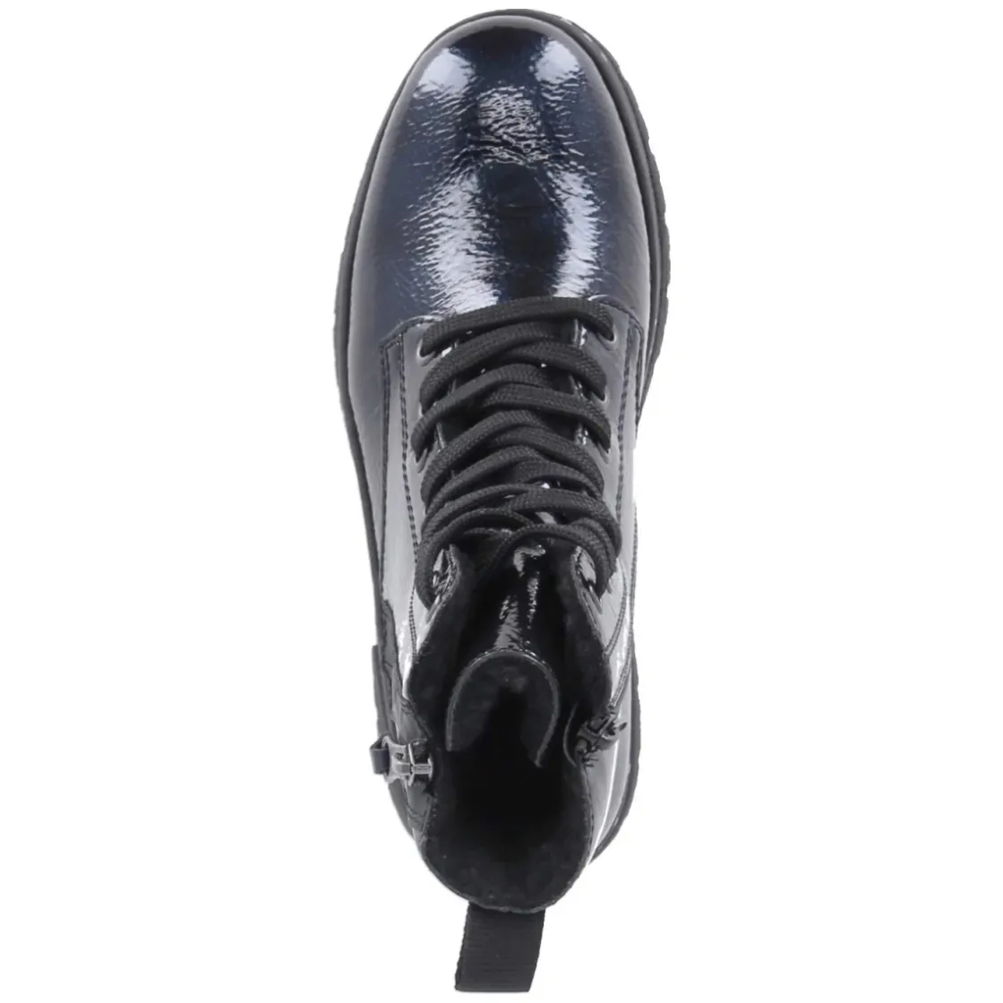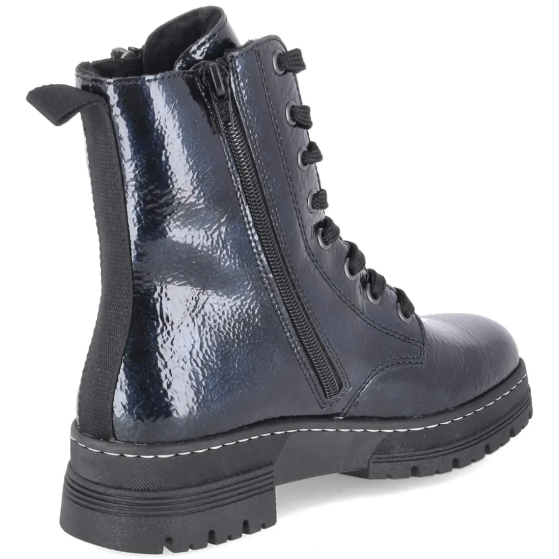 Winterboots von Rieker vereinen stilvolle Funktion für kalte Tage: Die elegante Lackoptik in dunklem Blau setzt ein edles Finish, das je nach Licht fast schwarz wirkt und vielfältig kombiniert werden kann. Obermaterial aus Synthetik, Warmfutter innen und eine textile Decksohle sorgen zusammen mit gepolstertem Fußbett für behagliche Wärme. Dank Wechselfußbett lassen sich eigene Einlagen nutzen. Der 4 cm hohe Blockabsatz und die rutschhemmende Laufsohle geben sicheren Halt, die runde Spitze und das relaxtes Leichtgewicht garantieren entspanntes Gehen. Schnürsenkel und seitlicher Reißverschluss erleichtern den Einstieg, ein außen gesetzter Zierreißverschluss, verstärkter Fersenbereich und Anziehlasche runden das Design ab. Der Schnitt fällt normal aus und passt zu unterschiedlichsten Outfits. Modetipp: Mit Wollmantel, Straight-Jeans und grobem Strickschal entsteht ein moderner City-Look, alternativ wirkt ein monochromes Schwarz-Outfit besonders harmonisch.