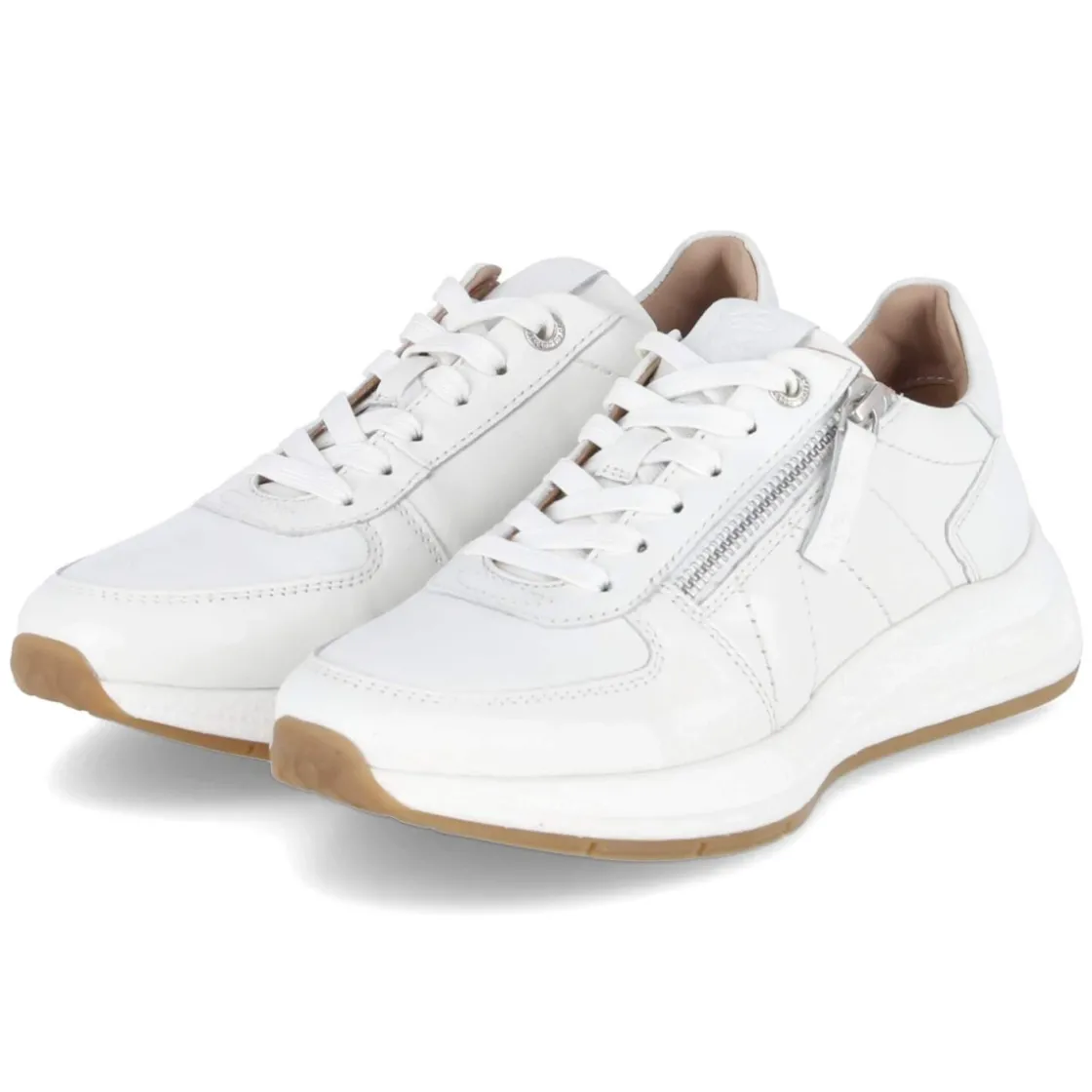 Der weiße Low Sneaker von Salamander setzt auf klare Linien und hochwertiges Glattleder. Die runde Kappe und der gepolsterte Einstieg sorgen für ein softes Tragegefühl, während verstärkte Zehen- und Fersenpartien zusätzliche Stabilität geben. Der Mix aus Schnürsenkeln und praktischem seitlichem Reißverschluss erleichtert das An- und Ausziehen. Ein komfortables, gepolstertes Lederfußbett lässt sich als Wechselfußbett herausnehmen. Die flexible, rutschhemmende Laufsohle punktet mit ca. 5% recyceltem Gummianteil – ein umweltfreundlicher, nachhaltiger Akzent. Die blaue, gelabelte Fersenklappe bringt subtile Farbtiefe in den cleanen Look. Mit geringem Gewicht und regulärer Passform ideal für den Alltag. Modetipp: Besonders modern wirkt der Sneaker zu Cropped-Jeans, einem hellen Stricktop und einem beigen Trenchcoat für einen frischen City-Look.