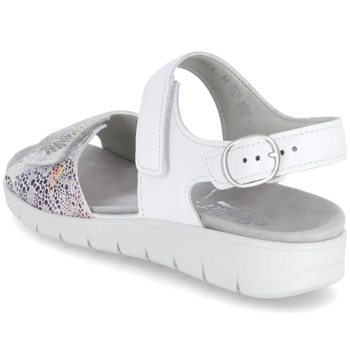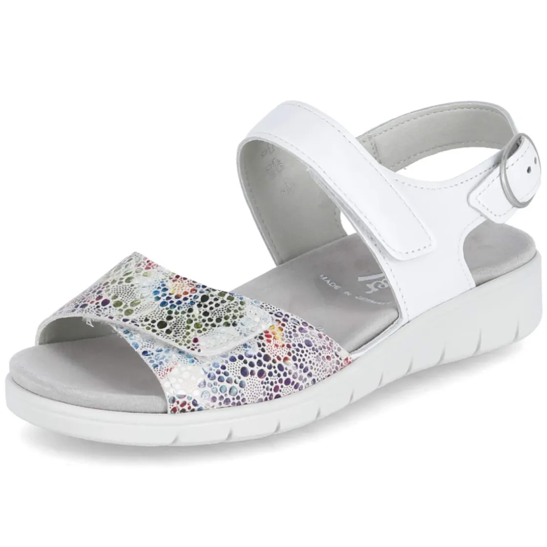 Die Sandalen FLOWER-SAMT/SOFT-N von Semler verbinden sommerliche Leichtigkeit mit verlässlichem Komfort. Weißes Echtleder bildet die hochwertige Basis, während ein bunter Punkteprint auf dem vorderen Riemen einen frischen Akzent setzt. Zwei praktische Klettverschlüsse und eine verstellbare Schnalle mit Druckknopf sorgen für passgenauen Halt bei normal ausfallender Größe. Das vorgeformte, herausnehmbare Wechselfußbett aus Leder unterstützt den Fuß angenehm und lässt sich bei Bedarf durch eigene Einlagen ersetzen. Die offene Schuhspitze unterstreicht die luftige Silhouette, die flexible, rutschfeste Laufsohle bietet Stabilität auf verschiedensten Untergründen. Langlebiges Leder und eine griffige Sohle machen das Modell zu einem zuverlässigen Begleiter für warme Tage. Modetipp: Zu einem leichten Leinenkleid oder verkürzten Jeans wirkt der Punkteprint als verspielter Farbtupfer und rundet dezente Sommerlooks stilvoll ab.