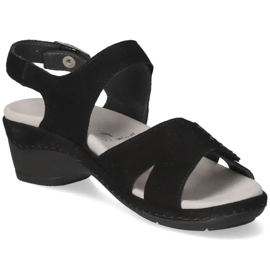 Diese Damen-Sandale von Semler verbindet edles Design mit wohltuendem Komfort. Weiches Rauleder in zeitlosem Schwarz umschmeichelt den Fuß, während atmungsaktives Echtleder innen für ein angenehm temperiertes Klima sorgt. Zwei Klettverschlüsse erlauben eine individuelle Anpassung, ergänzt von Schnalle und Druckknopf als praktische und dekorative Akzente. Schimmernde Schmucksteine setzen einen dezenten Glanz, die offene Spitze verleiht sommerliche Leichtigkeit. Ein vorgeformtes, gepolstertes Lederfußbett lässt sich bei Bedarf wechseln und unterstützt müheloses Gehen. Der 3,5 cm hohe Blockabsatz bietet sicheren Stand, die flexible, rutschhemmende Laufsohle verbessert die Traktion auf unterschiedlichen Untergründen. Das Modell fällt normal aus und eignet sich ideal für Erwachsene, die Wert auf Qualität legen. Modetipp: Besonders elegant wirkt die Sandale zu fließenden Midikleidern oder verkürzten Leinenhosen in Naturtönen.