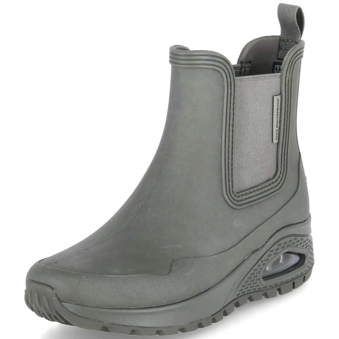 Die Gummistiefeletten UNO RUGGED von Skechers verbinden urbanen Regenwetterschutz mit modernem Style. Das wasserfeste Obermaterial aus Synthetik in sattem Grün hält bei Schauern zuverlässig trocken, während die Chelsea-Silhouette DANCING N THE RAIN mit zwei Elastikeinsätzen und Anziehlasche ein schnelles Hineinschlüpfen ermöglicht. Die sportliche, rutschfeste Profilsohle mit Sichtfenster sorgt für sicheren Halt auf nassem Untergrund, der verstärkte Fußrahmen verleiht Stabilität. Innen verwöhnt eine textile Decksohle mit erstklassiger Memory-Foam-Fußbettung, die selbst auf langen Wegen komfortabel abfedert. Die runde Schuhspitze und die normale Passform machen den Allrounder alltagstauglich vom Büro bis zum Wochenendspaziergang. Modetipp: Zur verkürzten Straight-Leg-Jeans, Feinstrick und Oversize-Trench wird das Grün zum frischen Farbakzent.