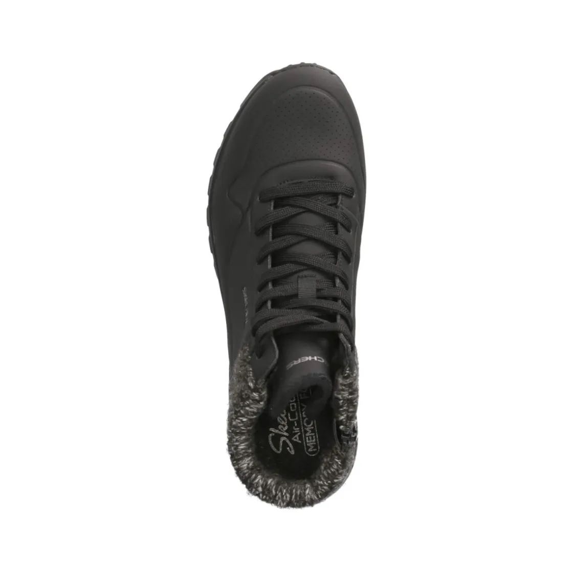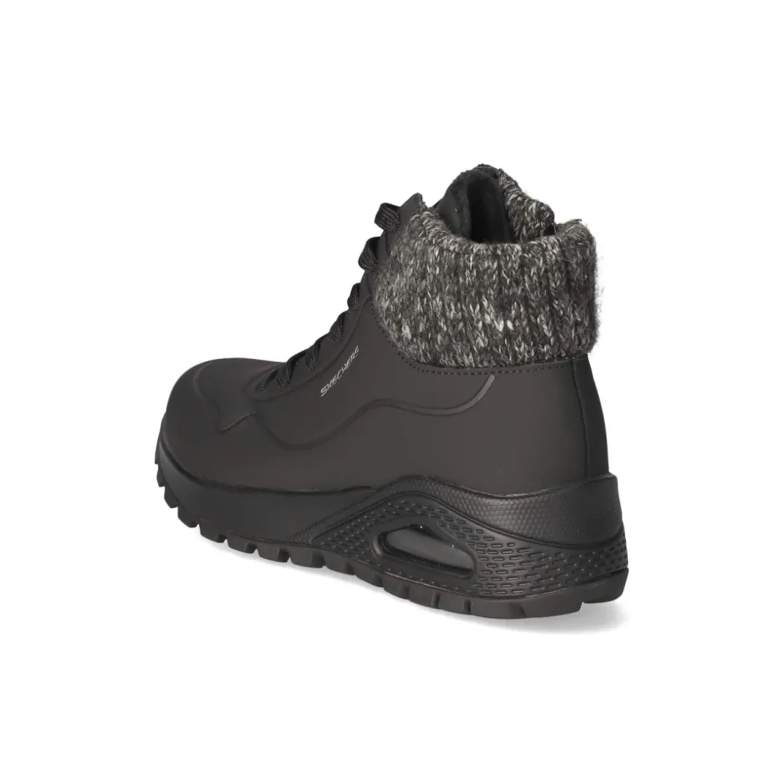 High Sneaker DARLING DAZE von Skechers verbindet urbanen Look mit wetterfestem Komfort. Der hohe Schaft mit textiler Polsterung schmiegt sich angenehm an, Warmfutter hält zuverlässig warm, und das gepolsterte Fußbett aus Textil sorgt für weichen Auftritt auf langen Wegen. Der robuste Textil‑Synthetik‑Mix zeigt dynamische Zierstreifen und fein gesetzte Lochstanz‑Details, während runde Kappe sowie verstärkter Zehen‑ und Fersenbereich Schutz und Formstabilität bieten. Für sicheren Tritt steht die flexible, rutschhemmende Profilsohle. Schnürsenkel erlauben individuelle Anpassung, der seitliche Reißverschluss eröffnet einen bequemen Einstieg. In klassischem Schwarz vielseitig kombinierbar und größengetreu. Modetipp: mit Mom‑Jeans, wolligem Mantel und sichtbaren Rippensocken entsteht ein lässiger City‑Winter‑Look.