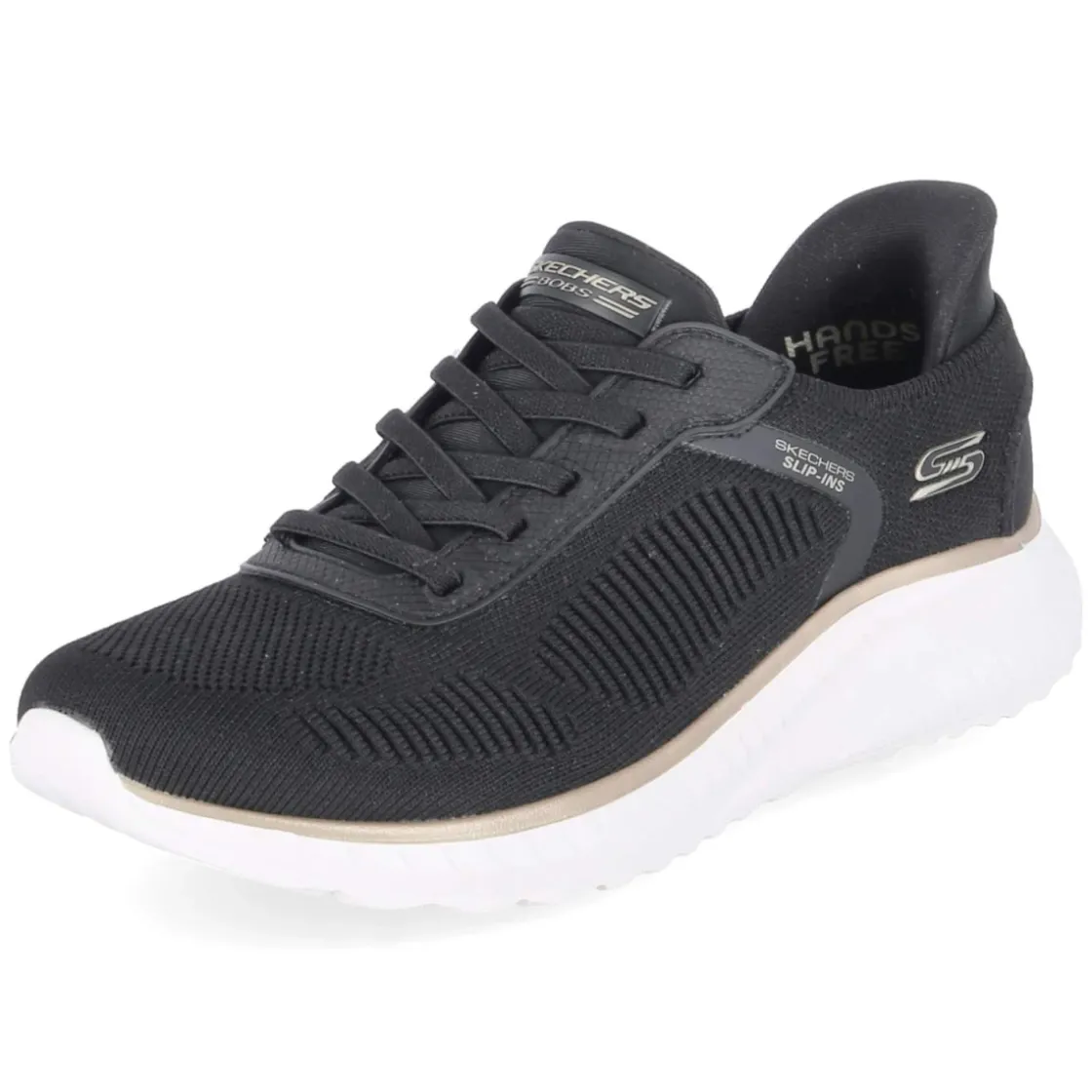 Der Slip-ins Sneaker CURRENT MUSE von Skechers verbindet entspannten Komfort mit urbanem Stil. Das schwarze Obermaterial aus atmungsaktivem Textil in Strick-Optik und Mesh legt sich weich an den Fuß, während das Elastikband in Schnüroptik sicheren Halt ohne Verschluss bietet. Das beste Memory-Foam-Fußbett passt sich jeder Bewegung an, das relaxt leichte Design schont bei langen Tagen Energie. Eine flexible, rutschfeste Laufsohle sorgt für zuverlässigen Grip, die runde Spitze und die passformtreue Weite machen den Schuh alltagstauglich. Dezente Highlights in Goldoptik setzen subtile Akzente, die textile Decksohle erhöht den Tragekomfort. Der CURRENT MUSE ist aus veganen Materialien gefertigt und lässt sich bei Bedarf in der Waschmaschine auffrischen. Modetipp: Ton-in-Ton mit schwarzer Wide-Leg, weißem Basic-Top und Oversize-Blazer stylen; filigraner Goldschmuck greift die Details elegant auf.