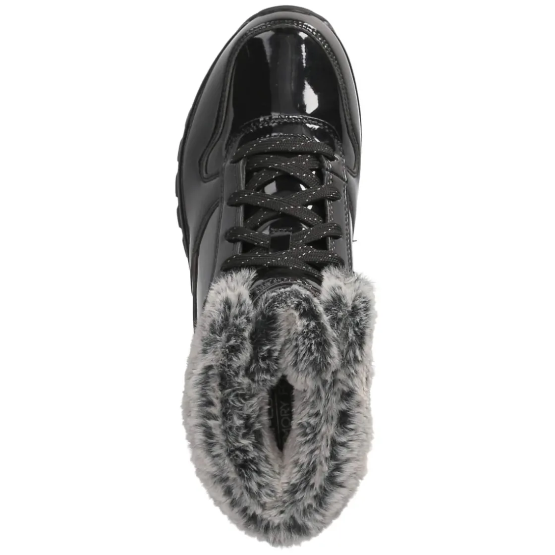 Der Skechers Sneaker UNO RUGGED vereint sportliche Linien mit einer eleganten Lackoptik in tiefem Schwarz. Das synthetische Obermaterial zeigt sich glatt und charakterstark, die runde Spitze wahrt den komfortablen Auftritt. Innen sorgt ein warmes Futter für behagliches Klima an kalten Tagen, während die textile Decksohle weich begleitet. Die Schnürung erlaubt präzise Anpassung und stabilen Halt, ohne die klare Silhouette zu stören. Die Passform fällt normal aus und macht die Wahl der Größe unkompliziert. Mit seinem cleanen Look passt das Modell zu urbanen Winterstyles ebenso wie zu dezenten Business-Casual-Outfits. Modetipp: Den Glanz des Schuhs mit matten Texturen wie Wollmantel, grobem Strick und einer geraden Denim balancieren, dazu eine strukturierte Crossbody-Bag für einen modernen Kontrast.