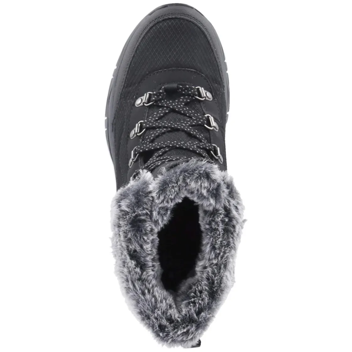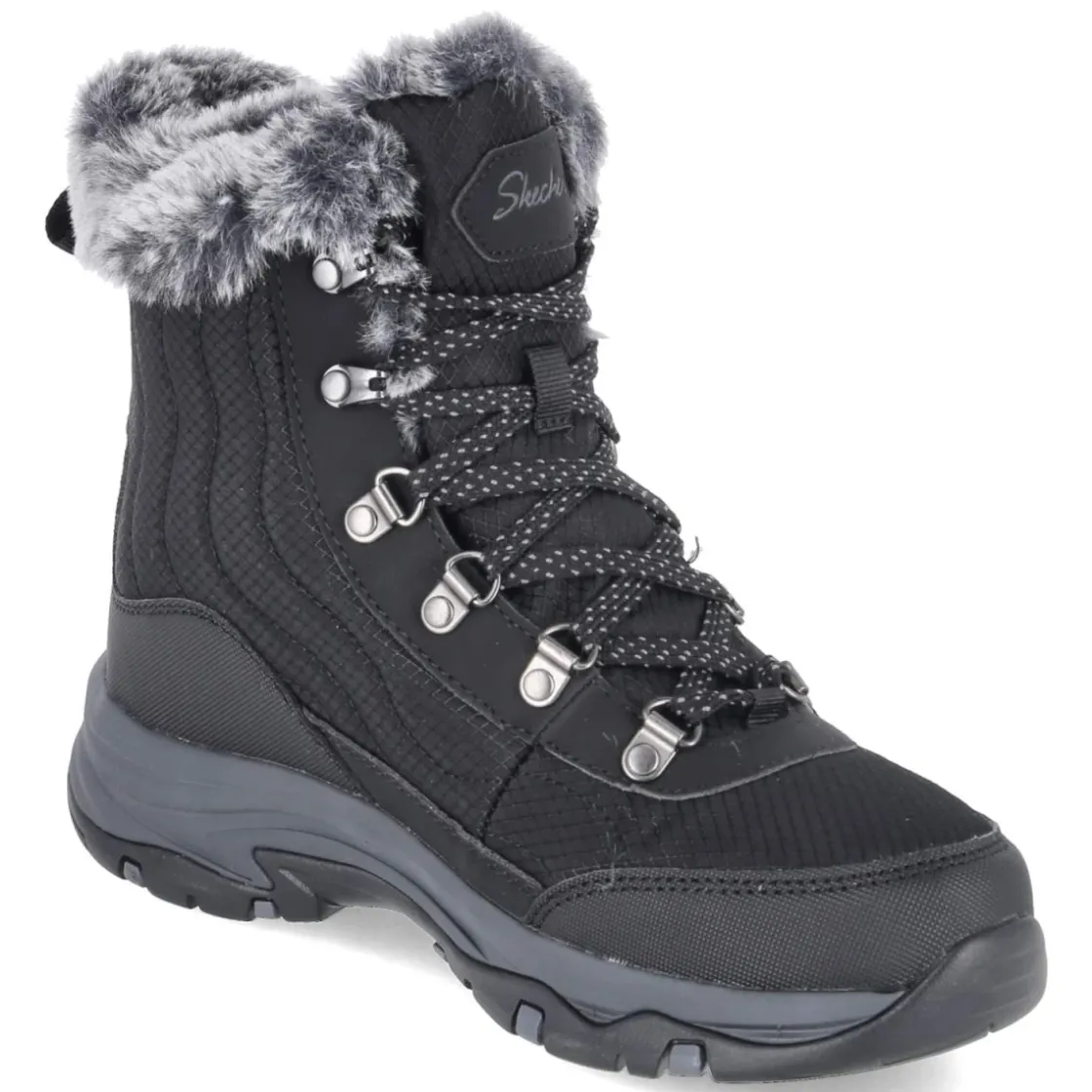 Der Snowboot TREGO-STORMIE von Skechers vereint funktionale Winter-Performance mit moderner Optik. Das Obermaterial aus Textil und Synthetik ist wasserabweisend, die Konstruktion zugleich wasserfest, während atmungsaktive Zonen das Klima regulieren. Warmfutter umschließt den Fuß, die beste Memory-Foam-Fußbettung entlastet bei jedem Schritt. Ein abgesteppter Schaft, verstärkter Fußrahmen und die rutschfeste Profilsohle geben Halt auf glatten Wegen. Die Schaftkrempe aus Kunstfell setzt einen weichen Akzent, die runde Spitze und die Schnürung sorgen für komfortablen Sitz; eine Anziehlasche erleichtert den Einstieg. In klassischem Schwarz und größengetreu geschnitten ist der Boot ideal für Damen im Alltag und Outdoor. Modetipp: Mit Steppjacke, Thermo-Leggings und grober Strickmütze entsteht ein cleaner City-Winterlook.