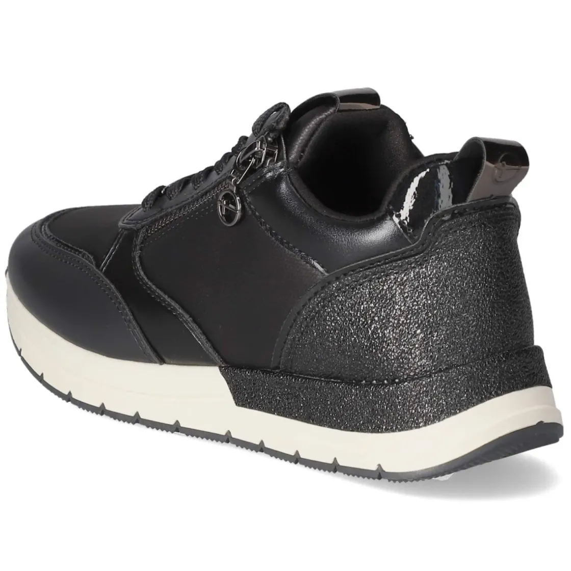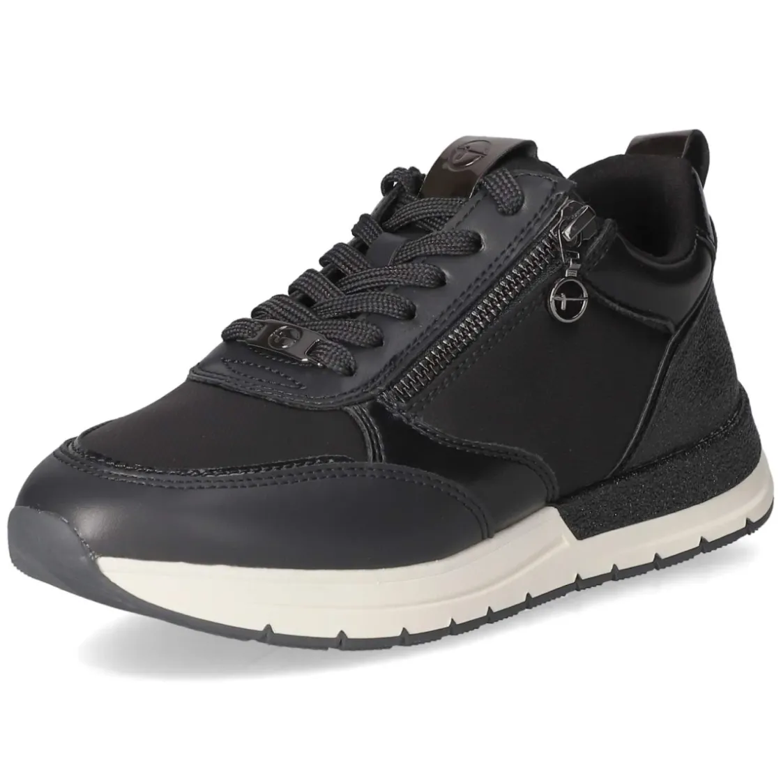 Der Low Sneaker von Tamaris setzt auf eine klare, moderne Silhouette mit runder Spitze und harmonischem Blauton, der je nach Licht fast Schwarz wirken kann. Das Obermaterial aus Textil und Synthetik wird durch eine verstärkte Ferse mit schimmernder Oberfläche und feinen metallischen Akzenten veredelt. Vegane Materialien unterstreichen den zeitgemäßen Anspruch. Für Alltagstauglichkeit sorgen ein angenehm gepolsterter Einstieg, Schnürsenkel in Kombination mit zusätzlichem Reißverschluss sowie eine flexible, rutschfeste Laufsohle. Die gepolsterte, herausnehmbare Decksohle ermöglicht individuelle Anpassung, während der Schnitt normal ausfällt und sofort vertrauten Tragekomfort bietet. Markendetails setzen dezente Highlights und betonen die feminine Low-Silhouette für Erwachsene. Modetipp: Besonders stimmig wirkt der Sneaker zu cropped Straight-Jeans und einem feinen Stricktop; ein nachtblaue Trenchcoat rundet den monochromen Look elegant ab.
