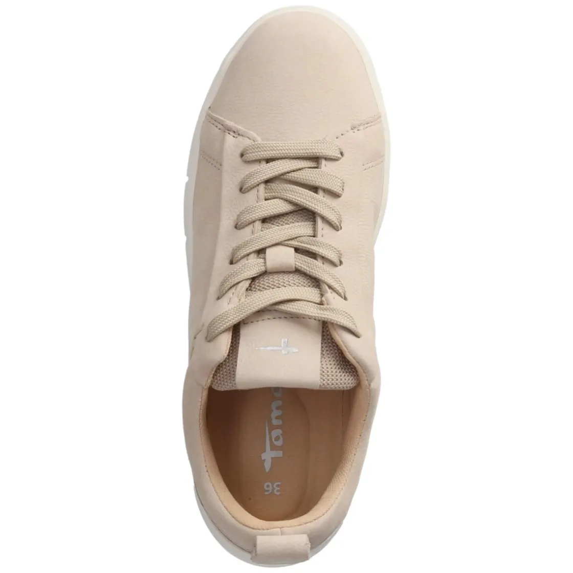 Der Low Sneaker von Tamaris in zartem Beige verbindet lässige Linien mit wertigem Rauleder und zeigt sich als zuverlässiger Allrounder für den Tag. Die runde Schuhspitze sorgt für ein angenehmes Zehengefühl, während der bequem gepolsterte Einstieg und die weich unterlegte Lasche sanften Halt geben. Dank Schnürung lässt sich die Passform individuell regulieren; die Ferse ist zusätzlich verstärkt. Im Inneren punktet eine textile Decksohle und ein gepolstertes, herausnehmbares Wechselfußbett, das bei Bedarf durch eigene Einlagen ersetzt werden kann. Atmungsaktive Mesh-Details lockern den Look auf, die Anziehlasche erleichtert das Hineinschlüpfen. Die flexible, rutschhemmende Laufsohle bietet Stabilität auf verschiedensten Untergründen. Fällt normal aus. Modetipp: Zu cremefarbenen Wide-Leg-Jeans und einem Stricktop entsteht ein harmonischer Monochrom-Look mit sanfter Eleganz.