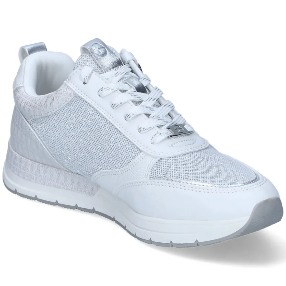 Der Low Sneaker von Tamaris in klarem Weiß verbindet modernen Chic mit hohem Tragekomfort. Vegane Materialien und ein Obermaterial aus Textil & Synthetik liefern eine leichte, pflegeleichte Basis, während glitzernde Highlights dem Design eine feminine Note verleihen. Der bequeme Reißverschluss-Einstieg ergänzt die Schnürung und ermöglicht unkompliziertes Hineinschlüpfen. Die runde Spitze, dezente Markendetails, eine Anziehlasche sowie verstärkte Zehen- und Fersenbereiche erhöhen Alltagstauglichkeit und Halt. Die robuste, profilierte Laufsohle sorgt für zuverlässigen Grip. Innen verwöhnt eine textile Decksohle mit bester Memory-Foam-Fußbettung; das Wechselfußbett lässt sich bei Bedarf austauschen. Der Sneaker fällt normal aus und passt so mühelos in die gängige Größe. Modetipp: Für einen frischen City-Look zu Cropped-Jeans und einem hellen Blazer kombinieren – die glitzernden Akzente setzen subtile Highlights.