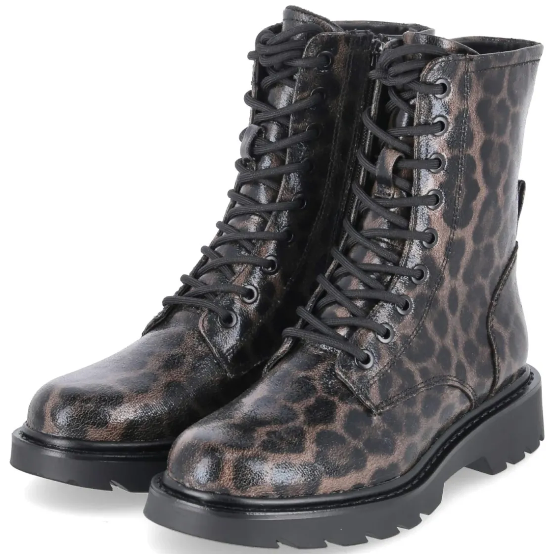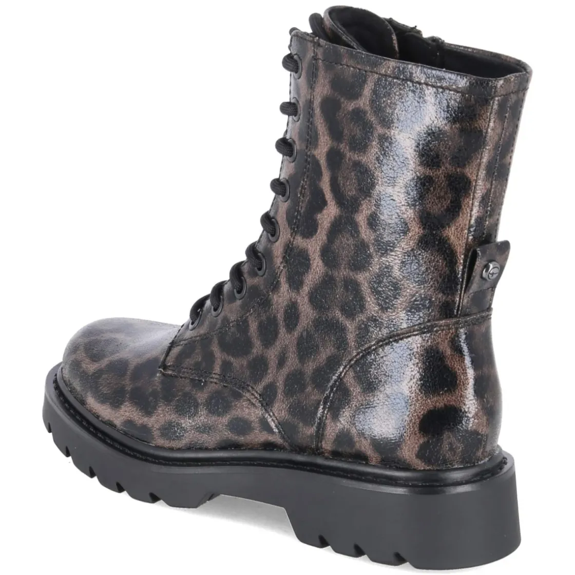Die Schnürstiefeletten von Tamaris vereinen markantes Design und hohen Komfort. Der braune Animal Print mit feinem Leopardmuster setzt ein modisches Statement, während der 4 cm hohe Blockabsatz und die runde Spitze für entspanntes Gehen sorgen. Das Obermaterial aus Textil und die textile Decksohle umschmeicheln den Fuß, das gepolsterte Fußbett entlastet bei jedem Schritt. Dank Schnürsenkeln und zusätzlichem Reißverschluss gelingt der Einstieg bequem, die verstärkte Ferse gibt Stabilität. Die rutschfeste Profilsohle bietet zuverlässigen Halt, das leichte Futter wärmt angenehm an kühlen Tagen. Mit Schafthöhe ca. 17 cm und Umfang ca. 24 cm sitzt der Schuh sicher am Knöchel und fällt normal aus. Aus veganen Materialien gefertigt, ohne Kompromisse bei Stil und Tragegefühl. Modetipp: Besonders wirkungsvoll zu Straight-Leg-Jeans in Dunkelblau und einem camelfarbenen Wollmantel, dazu ein schmaler Gürtel im Leo-Detail.