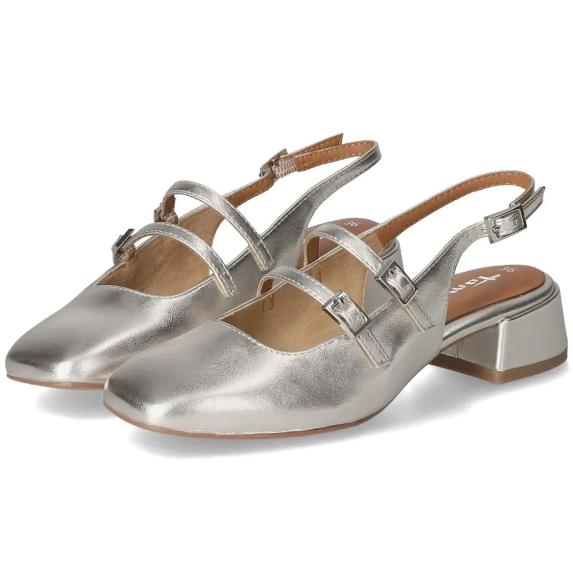 Diese Slingpumps von Tamaris vereinen modernen Chic mit Alltagstauglichkeit. Das silberfarbene Metallic-Finish mit schimmernder Oberfläche setzt ein edles Statement, während die karreeförmige Spitze dem Design eine aktuelle Note gibt. Drei silberfarbene Schnallen mit Elastikeinsatz sorgen für sicheren Halt und eine flexible Anpassung, die Passform fällt normal aus. Der 3,5 cm hohe Blockabsatz bietet stabilen Stand, die flexible Laufsohle unterstützt ein geschmeidiges Abrollen. Ein gepolstertes Lederfußbett und die Decksohle aus Leder erhöhen den Tragekomfort, das pflegeleichte Synthetik-Obermaterial bleibt formschön. Modetipp: Als glänzender Akzent zu monochromen Looks in Schwarz oder Weiß getragen, entsteht ein spannender Kontrast; mit Cropped-Jeans und Blazer gelingt der Mix aus lässig und elegant.