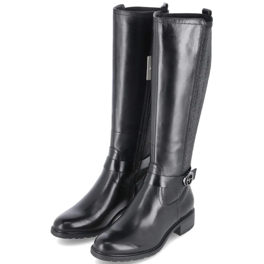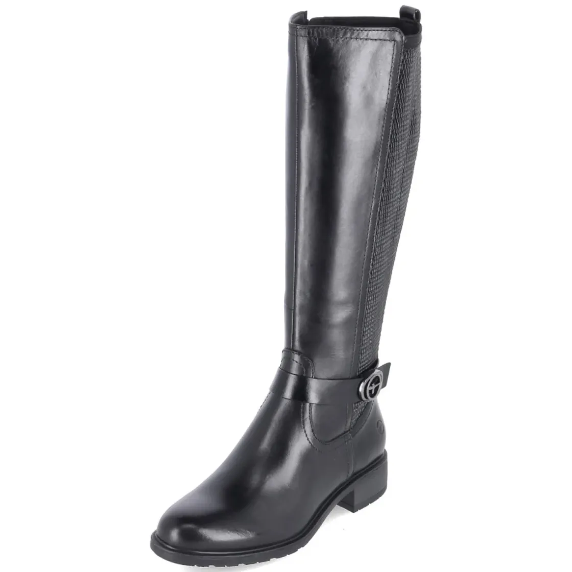 Dieser schwarze Tamaris Stiefel kombiniert einen modernen Material-Mix aus Leder und Synthetik mit alltagstauglichem Komfort. Der runde Leisten und der stabile Blockabsatz mit 3,5 cm Höhe sorgen für ein entspanntes Laufgefühl, unterstützt vom gepolsterten Fußbett und der textilen Decksohle. Ein praktischer Reißverschluss erleichtert das Anziehen, zusätzlich hilft die Anziehlasche. Der Schaft misst ca. 38 cm in der Höhe bei ca. 34 cm Umfang; zwei große Elastikeinsätze in Flechtoptik am hinteren Schaft geben Flexibilität und passen sich dem Bein an. Die flexible, rutschfeste Laufsohle und der Knöchelriemen mit Logo runden das Design ab. Fällt normal aus und bietet vielfältige Kombinationsmöglichkeiten für Damen. Modetipp: Zu Strickkleid und Mantel entsteht ein femininer Look, mit Skinny-Jeans und Oversize-Pullover wirkt der Stiefel urban und lässig.