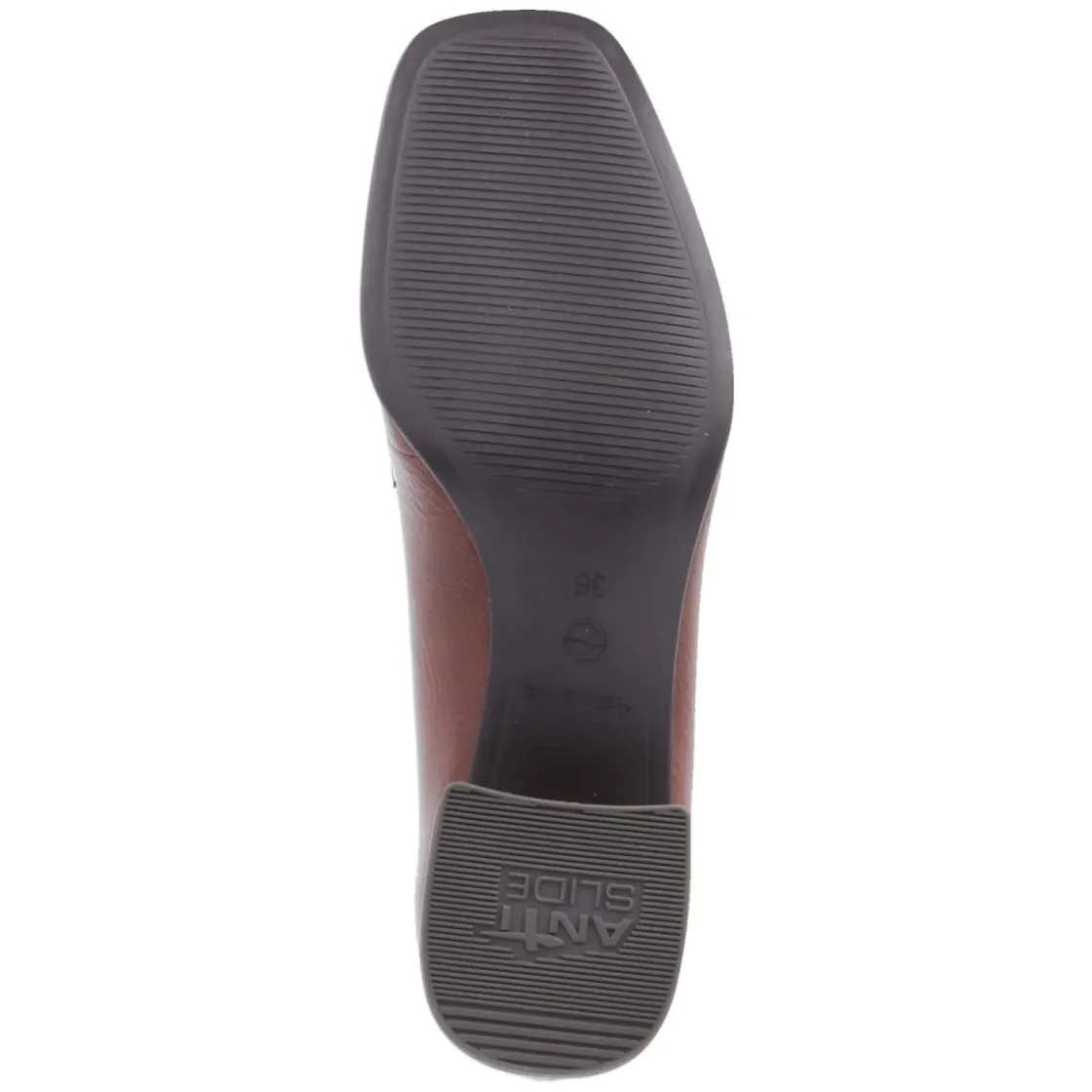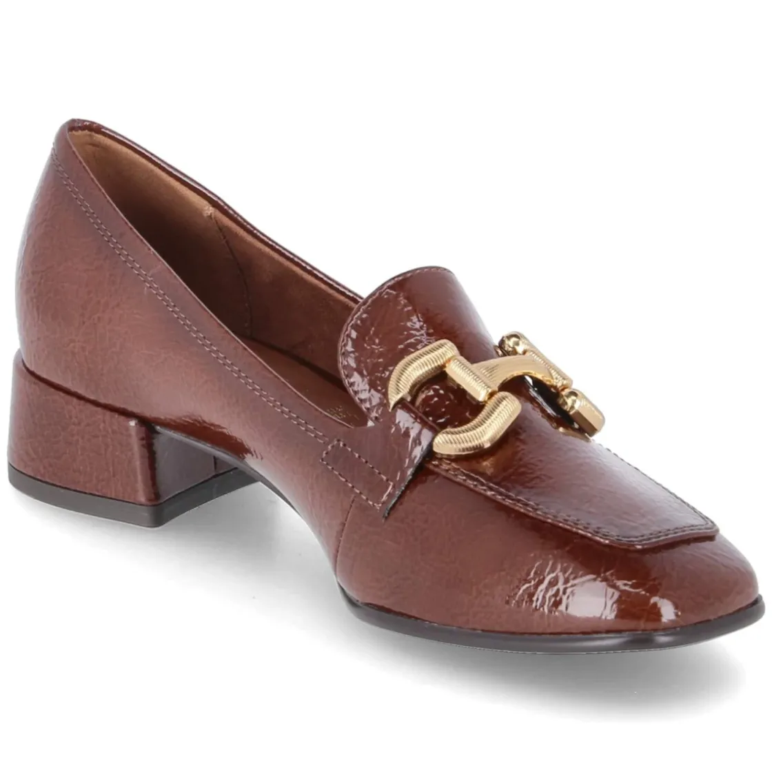 Tamaris präsentiert mit dem Trotteur in Braun einen eleganten Begleiter, der zeitlose Linien mit modernem Finish verbindet. Die glänzende Lackoptik setzt den goldfarbenen Zierriemen effektvoll in Szene, während die Karree-Spitze dem Look eine markante Note verleiht. Der 3,5-cm-Blockabsatz sorgt für stabilen Halt und eine angenehme Höhe im Alltag. Dank unkompliziertem Einstieg ohne Verschluss gelingt das Hineinschlüpfen mühelos. Das gepolsterte Fußbett und die Decksohle aus Leder und Synthetik bieten spürbaren Komfort, die flexible, rutschfeste Laufsohle begleitet souverän durch den Tag. Der Schuh fällt normal aus und richtet sich an Erwachsene, die raffinierten Minimalismus schätzen. Modetipp: Zu cropped Wollhosen und einem feinen Rollkragenpullover getragen entsteht ein puristischer City-Chic; für abends akzentuiert ein Satinrock in Midilänge die glänzenden Details besonders stilsicher.
