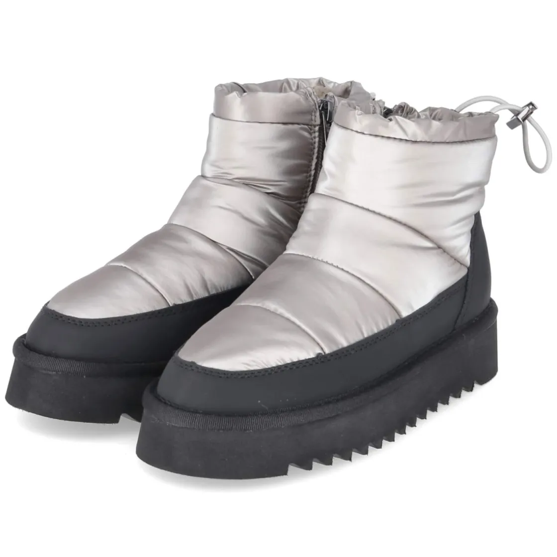 Die Winterboots von Tamaris vereinen Retro-Snowboot-Charme mit funktionalem Komfort. Das seidig glänzende, quer gesteppte Obermaterial aus Synthetik ist besonders pflegeleicht und wird von einem weichen Schaft mit Gummizug und Schnellverschluss ergänzt, der zusammen mit dem praktischen Reißverschluss ein bequemes Ein- und Aussteigen ermöglicht. Warmfutter und eine textile Decksohle sorgen an kalten Tagen für behagliche Wärme, während der verstärkte Fußrahmen und die voluminöse, dennoch erstaunlich leichte Sohle Stabilität bei geringem Gewicht bieten. Die runde Schuhspitze und der 3,5 cm hohe Plateauabsatz unterstützen einen modernen Look in strahlendem Silber. Der Schuh fällt normal aus und richtet sich an Damen, die einen markanten Winterauftritt schätzen. Modetipp: In Kombination mit einem langen Steppmantel und grob gestrickten Wollsocken in Grautönen entsteht ein stilvoller, urbaner Winter-Look.