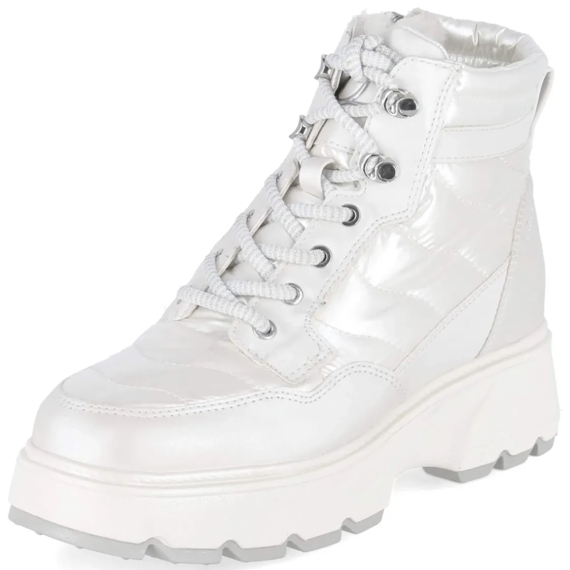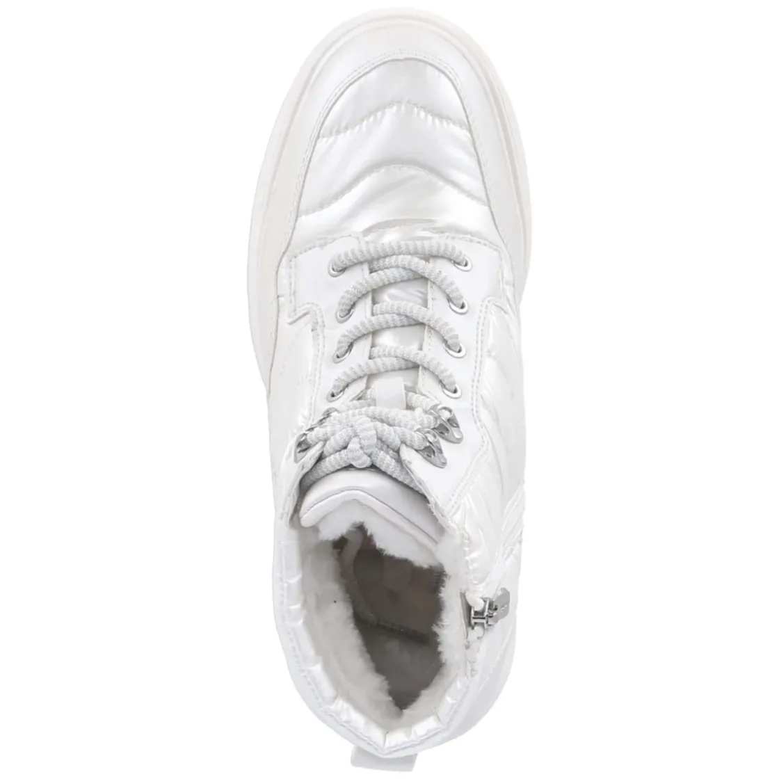 Der Tamaris Wintersneaker in strahlendem Weiß verbindet urbanen Look mit wintertauglichem Komfort. Das Obermaterial aus Textil und Synthetik zeigt eine abgesteppt wirkende Oberfläche mit seidigem Glanz, während die runde Schuhspitze und das 4-cm-Plateau eine moderne Silhouette formen. Warmfutter und gepolsterte Thermoeinlage sorgen für behagliche Wärme an kalten Tagen, das Wechselfußbett ermöglicht individuelle Anpassung. Der zusätzliche Reißverschluss neben der Schnürung erleichtert das An- und Ausziehen, eine Anziehlasche unterstützt dabei. Verstärkte Fersen- und Zehenbereiche geben Stabilität, die wasserabweisende Ausstattung hält Feuchtigkeit zuverlässig ab. Aus veganen Materialien gefertigt, bietet das Modell eine tierfreundliche Alternative ohne Kompromisse im Stil. Modetipp: In Kombination mit heller Steppjacke und cremefarbenem Strickkleid entsteht ein cleaner Winter-Look mit sportivem Finish.