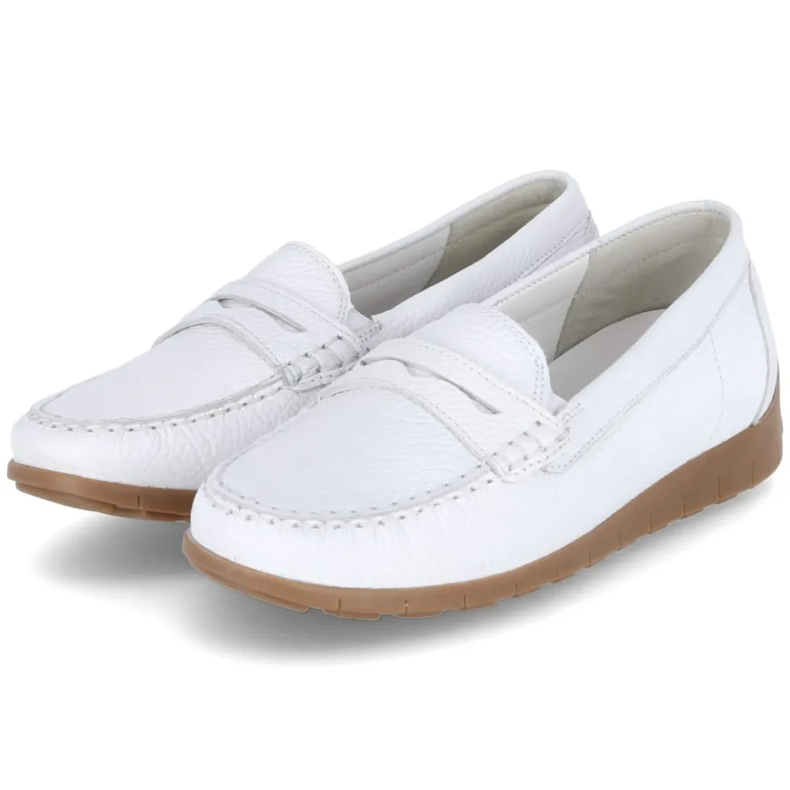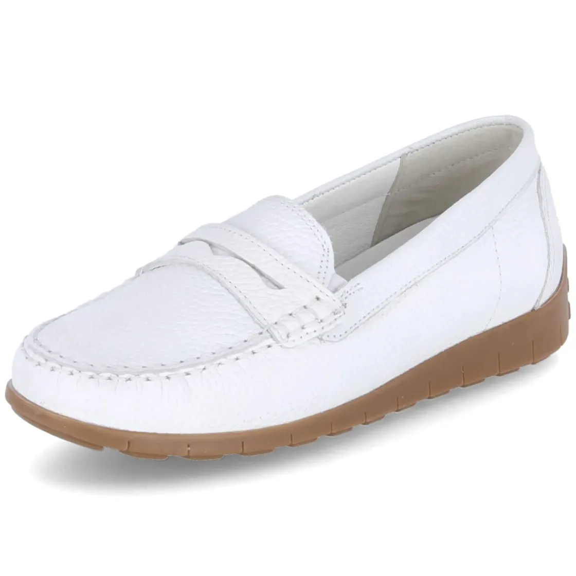 Mokassins LUCY von Waldläufer vereinen zeitlose Eleganz mit durchdachtem Komfort. Feines, weißes Glattleder in robuster Qualität schmiegt sich dank rund zulaufender Form angenehm an den Fuß, Ziernähte und klassischer Zierriemen unterstreichen den authentischen Mokassin-Charakter. Ein verstärkter Einstieg und die stabilisierte Ferse geben Halt, während Lederfutter und das gepolsterte, herausnehmbare Lederfußbett mit Wechselfunktion für wohltuende Dämpfung auf langen Tagen sorgen – auch ideal für eigene Einlagen. Die flexible, rutschhemmende Laufsohle unterstützt einen natürlich-weichen Abrollvorgang. Fällt größengetreu aus und lässt sich mühelos kombinieren, vom City-Look bis zum Büro. Modetipp: Zu cremefarbenen Chinos und einem lockeren Stricktop entsteht ein klarer, sommerlicher Auftritt.