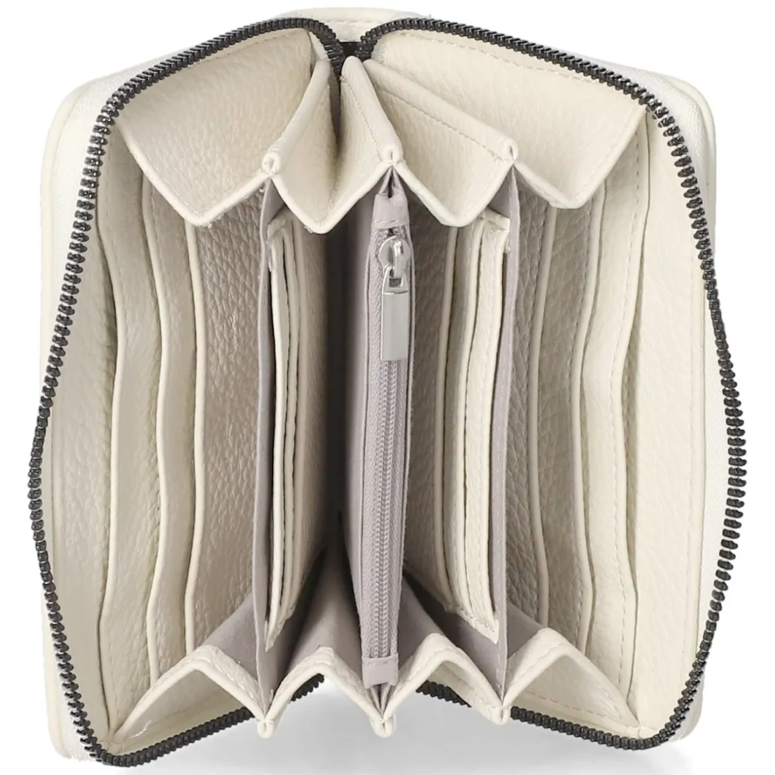 Zeitlose Eleganz im Taschenformat: Diese weiße Geldbörse für Damen überzeugt als klassisches Modell mit klarer Linienführung und einem dezent schimmernden, silberfarbenen Markenlogo. Ein rundumlaufender Reißverschluss schützt den Inhalt, innen sorgt das durchdachte Layout für Übersichtlichkeit: ein Reißverschluss-Münzfach, vier Geldscheinfächer, sechs Visitenkartenfächer und sechs zusätzliche Steckfächer nehmen Alltägliches strukturiert auf. Die griffige Haptik und hochwertige Verarbeitung machen sie zum langlebigen Begleiter für Büro, City und Reise. Kontrastierende Metallakzente unterstreichen die moderne Note, ohne den puristischen Charakter zu stören. Modetipp: Besonders stimmig zu monochromen Looks in Weiß, Grau oder Schwarz und mit silberfarbenem Schmuck oder Hardware an Tasche und Gürtel kombiniert.