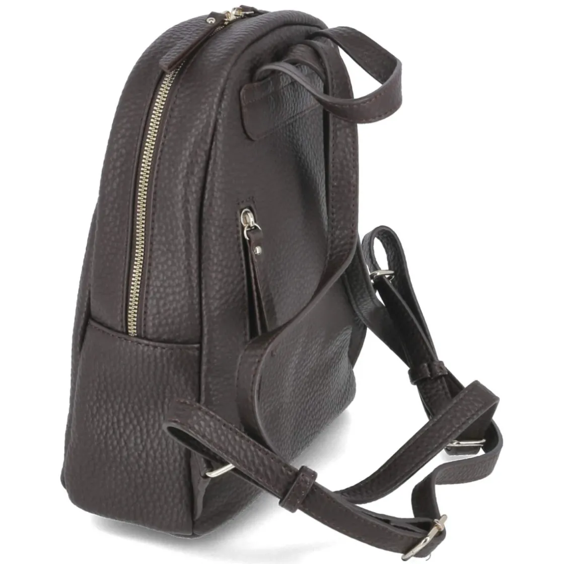Dieser Damenrucksack in sattem Braun verbindet stilvolle Zurückhaltung mit cleverer Aufteilung. Dunkelbraune Partien und Metallelemente in goldener Optik setzen elegante Akzente, während die kompakten Maße von ca. 30 x 24 x 11 cm bei einem Volumen von ca. 7 Litern genug Platz für Alltags-Essentials bieten. Verstellbare Tragegurte bis ca. 80 cm und ein stabiler Henkel sorgen für komfortable Tragemöglichkeiten, der verstärkte Boden bewahrt die Form. Zwei Fronttaschen und ein praktisches Rückenfach halten Wichtiges schnell griffbereit. Das Reißverschlusshauptfach schützt den Inhalt, innen strukturieren ein Steckfach und ein zusätzliches Reißverschlussfach die persönlichen Dinge. Modetipp: Zu camelfarbenem Mantel, dunkler Denim und goldenen Accessoires kombinieren, um die warmen Töne und die Hardware harmonisch aufzugreifen.