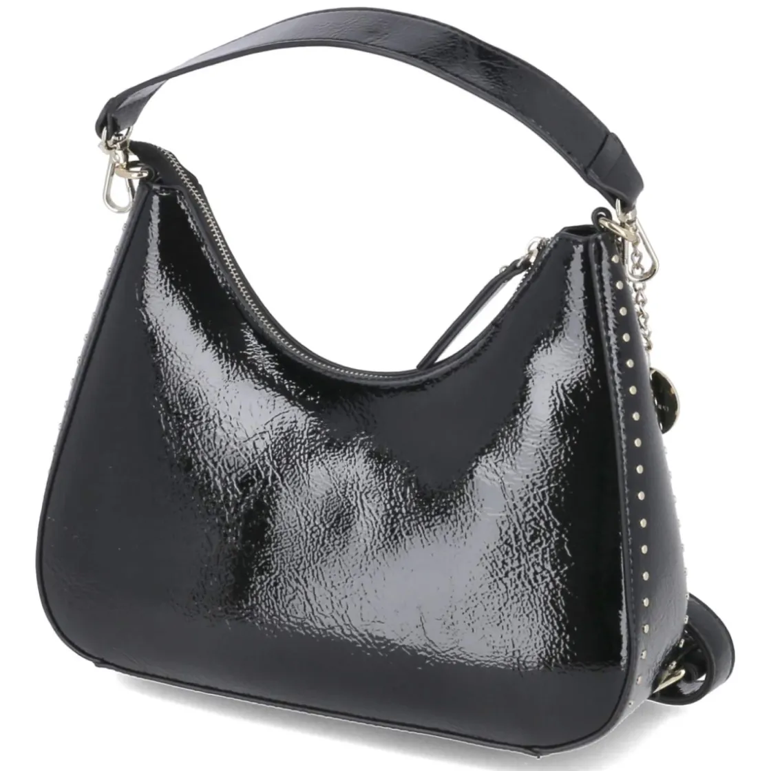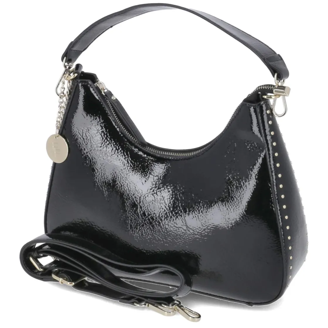 Zeitloses Design trifft auf markante Details: Die schwarze Damen-Schultertasche überzeugt mit kompakter Silhouette und durchdachten Proportionen. Das Format von ca. 15 x 30 x 9 cm bietet bei ca. 4 Litern Volumen ausreichend Platz für Essentials, während ein sicher schließender Reißverschluss den Inhalt schützt. Golden glänzende Metallteile und ein seitlicher Nietenbesatz setzen edle Akzente, der verstärkte Boden sorgt für Formstabilität. Zwei Trageoptionen erhöhen die Flexibilität: ein kurzer Riemen mit ca. 40 cm für die Schulter sowie ein verstellbarer Riemen mit ca. 140 cm für lässiges Crossbody-Tragen. Innen strukturieren ein Steckfach und ein Reißverschlussfach die Organisation. Modetipp: Zu einem All-Black-Look mit feinen Goldschmuck-Details kombinieren, um den eleganten Glanz der Hardware aufzugreifen.