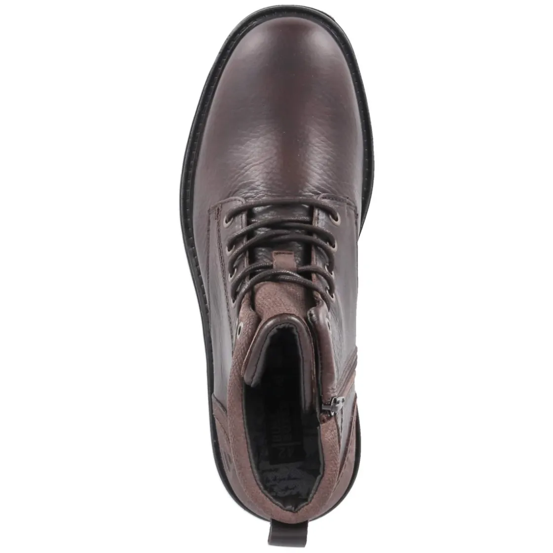Der Herren-Boot von Bullboxer verbindet robuste Eleganz mit durchdachtem Komfort. Glattes Echtleder in Braun verleiht dem Modell eine wertige Anmutung, der rund gestaltete Leisten und der 3‑cm‑Blockabsatz sorgen für ein souveränes Auftreten. Schnürsenkel werden durch einen zusätzlichen Reißverschluss ergänzt, wodurch das An- und Ausziehen besonders unkompliziert gelingt. Innen verwöhnt ein leicht gepolsterter Einstieg, eine textile Decksohle und ein komfortables, herausnehmbares Wechselfußbett. Der verstärkte Fersenbereich stabilisiert, während die rutschfeste Profilsohle zuverlässigen Grip auf verschiedenem Untergrund bietet. Das passformtreue Design fällt normal aus und überzeugt im Alltag wie im Office. Modetipp: Zu dunkler Denim, Stricksweater und einem dunelbraunen Ledergürtel entsteht ein zeitlos abgestimmter Look.