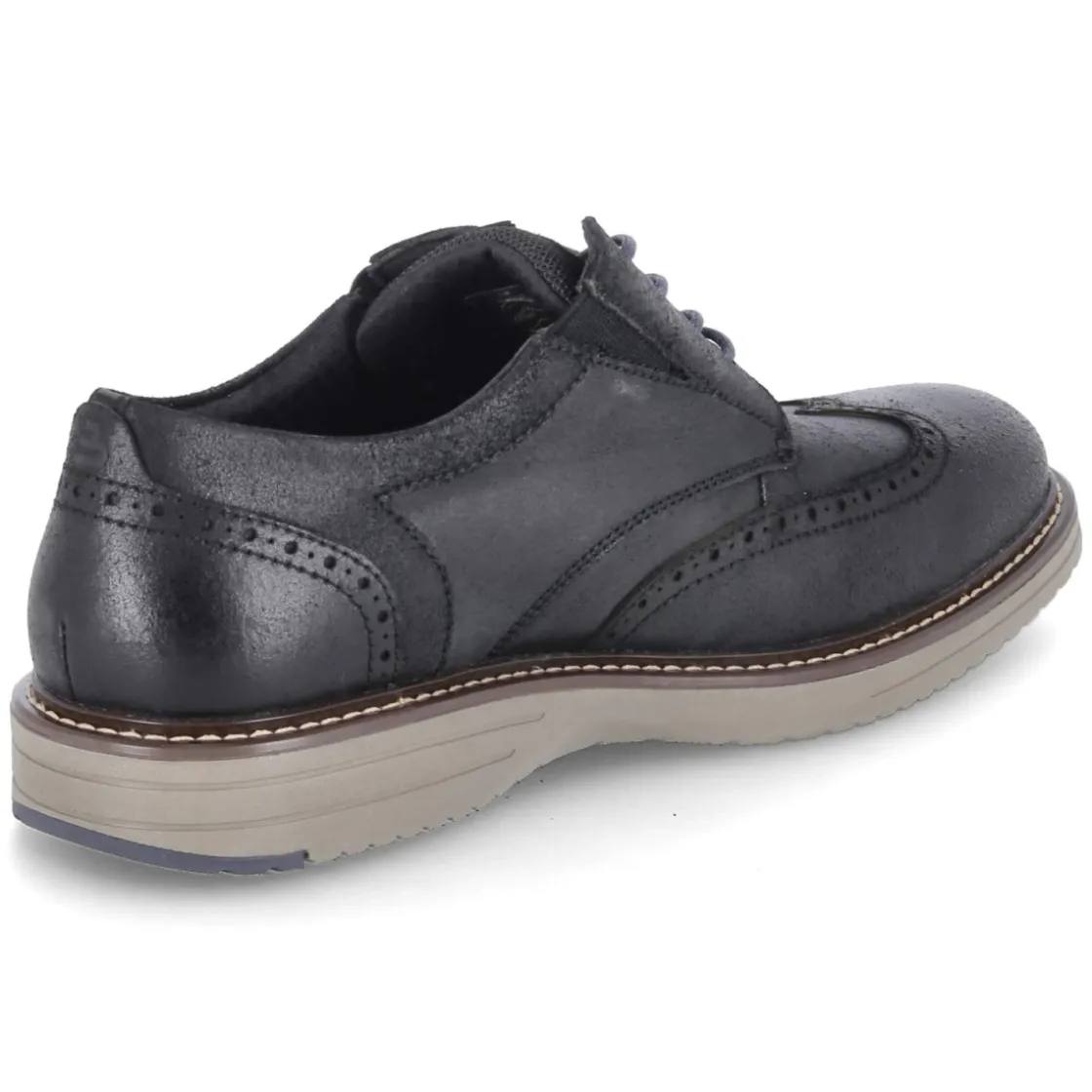 Der schwarze Halbschuh von Bullboxer verbindet klassische Budapester-Ästhetik mit modernem Komfort. Langlebiges Echtleder und die runde Spitze sorgen für einen souveränen Auftritt, während die blaue Schnürung und gelabelte Details einen frischen Akzent setzen. Kleine Elastikkeile seitlich des Spanns erleichtern den Einstieg und unterstützen den passgenauen Sitz, der Größenhinweis fällt normal aus. Das komfortable Wechselfußbett mit Textildecksohle lässt sich bei Bedarf austauschen, ideal für eigene Einlagen. Ein verstärkter Fersenbereich, der leicht gepolsterte Einstieg sowie die flexible Laufsohle mit leichtem Profil und rutschhemmendem Fersenelement bieten sicheren Halt im Alltag. Handcrafted verarbeitet, bleibt der Schuh trotz robuster Materialien ein relaxtes Leichtgewicht. Modetipp: Mit schmaler Chino, Ledergürtel in Schwarz und einem strukturierten Hemd entsteht ein smartes Business-Casual-Outfit.