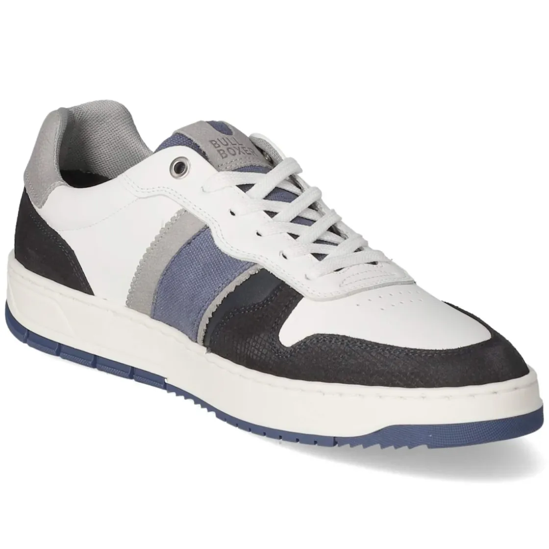 Der Low Sneaker von Bullboxer setzt auf zeitlose Klarheit und präzise Details. Glattes, atmungsaktives Echtleder in strahlendem Weiß bildet die Bühne, während schwarze Rauleder-Verstärkungen an Zehen und Ferse für Formstabilität und Schutz sorgen. Graue Akzente und blaue Zierstreifen in Textil bringen sportliche Dynamik. Das gelochte Schuhdeck unterstützt die Luftzirkulation, der gepolsterte Einstieg und das leichte Textilfutter erhöhen den Tragekomfort. Dank runder Kappe, klassischer Schnürung und Wechselfußbett bleibt das Modell anpassungsfähig und alltagstauglich; die flexible, rutschhemmende Laufsohle begleitet sicher durch die Stadt. In Handarbeit gefertigt und mit normal ausfallender Passform überzeugt der Herrensneaker als vielseitiger Begleiter. Modetipp: Zu schmalen Chinos in Grau und einem weißen Overshirt kombinieren, dazu ein blauer Gürtel, der die Zierstreifen aufgreift.