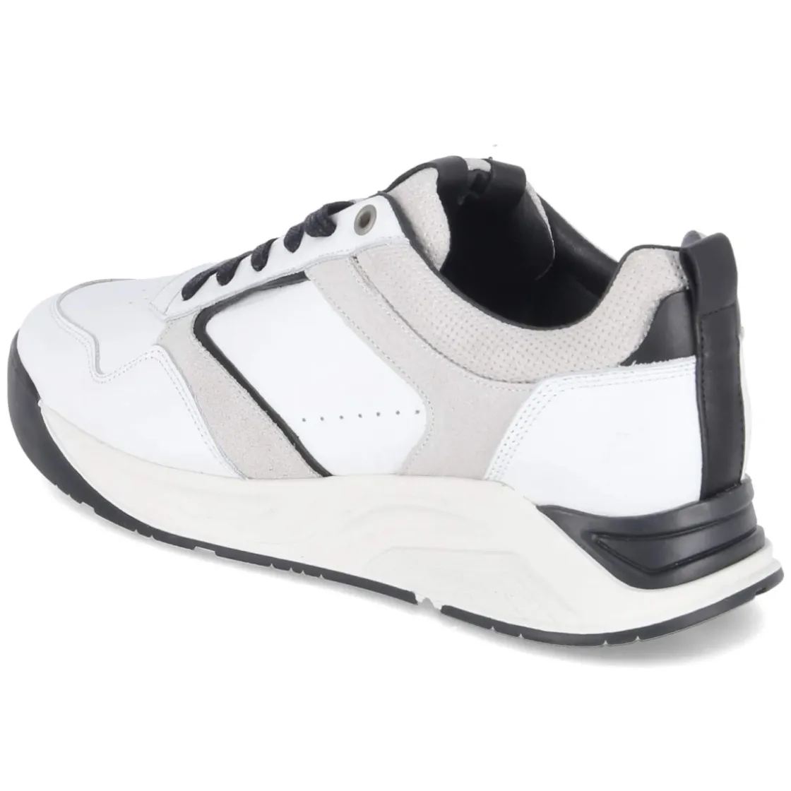 Der Low Sneaker von Bullboxer verbindet klare Linien mit funktionalem Komfort. Das Obermaterial aus langlebigem Echtleder zeigt sich in frischem Weiß, kontrastiert von schwarzen Details und veredelt durch dezente Lochungen. Die runde Spitze und die klassische Schnürung unterstreichen die moderne Optik, während ein verstärkter Fersen- und Zehenbereich sowie die flexible, rutschfeste Laufsohle zuverlässigen Halt im Alltag bieten. Ein gepolsterter Einstieg und die textile Decksohle sorgen für ein angenehm weiches Tragegefühl; das komfortable Wechselfußbett lässt sich bei Bedarf austauschen. Handcrafted gefertigt und in passgenauer Weite gehalten, fällt das Modell normal aus und eignet sich ideal für erwachsene Herren, die Wert auf Qualität legen. Modetipp: Mit schmaler Chino und cleanem Strickpolo entsteht ein minimalistischer City-Look, der den Sneaker souverän in den Mittelpunkt rückt.