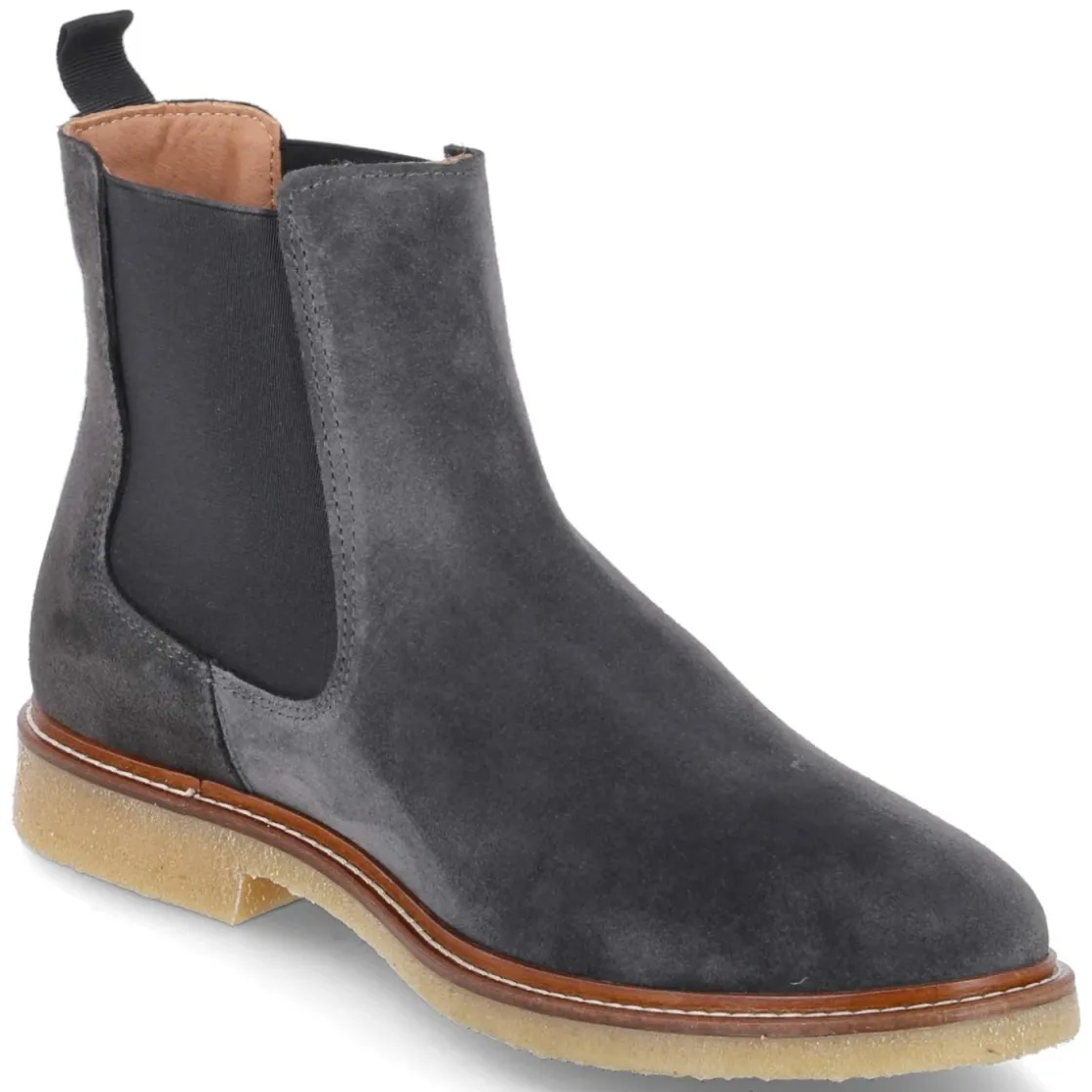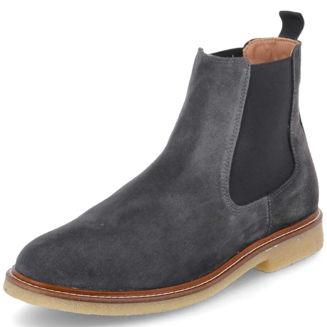 Der Chelsea Boot von Kaerlek für Herren interpretiert eine zeitlose Silhouette im edlen Grauton. Echtes, langlebiges Rauleder verleiht eine wertige Haptik und bewahrt dank verstärkter Ferse dauerhaft die Form. Seitliche Elastikeinsätze und Anziehlasche ermöglichen den komfortablen Einstieg ganz ohne Verschluss. Ein weiches Fußbett mit synthetischer Decksohle sorgt für angenehmes Klima, die runde Spitze bietet entspannten Zehenraum. Der 3 cm hohe Blockabsatz gibt dezente Höhe und Stabilität, die flexible, griffige Laufsohle begleitet souverän durch den Tag. Fällt normal aus und überzeugt mit vielfältigen Styling-Optionen zwischen Office und Freizeit. Modetipp: Zu navyfarbenen Chinos, Rollkragen-Strick und einem grauen Wollmantel entsteht ein eleganter Ton-in-Ton-Look, der die klare Form des Boots in den Mittelpunkt stellt.