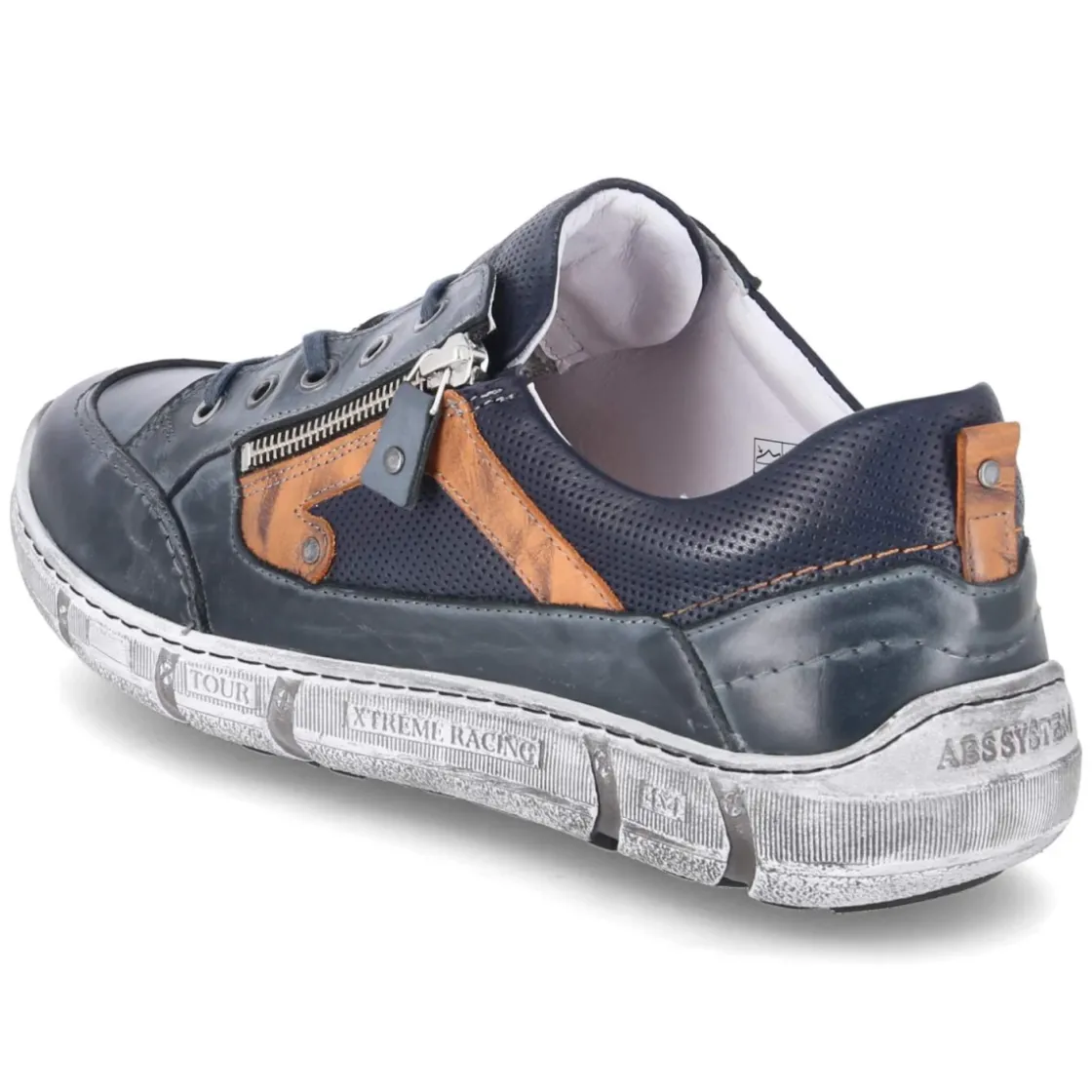 Dieser Herren-Halbschuh von Krisbut bringt sportliches Design und lässige Optik überzeugend zusammen. Dunkelblaues Glattleder mit Used-Look verleiht Charakter, der orangefarbene Seitenstreifen setzt einen frischen Akzent. Das robuste Echtleder und der verstärkte Zehen- und Fersenbereich sorgen für Strapazierfähigkeit im Alltag. Die runde Schuhspitze und die flexible Laufsohle unterstützen einen natürlichen Abrollvorgang, während das komfortable Wechselfußbett individuell anpassbare Dämpfung bietet. Durch die Kombination aus Schnürsenkeln und Reißverschluss gelingt der Einstieg besonders bequem und sicher. Eine Decksohle aus Leder sorgt für ein angenehmes Fußklima, die Passform fällt normal aus. Ob zum Wochenendbummel oder ins Büro, dieser Halbschuh beweist Vielseitigkeit und Komfort. Modetipp: Zu Slim-Jeans in Dunkelwaschung und einem leichten Strickpullover tragen, dazu eine graue Overshirt-Jacke für einen urbanen Look mit smarter Note.