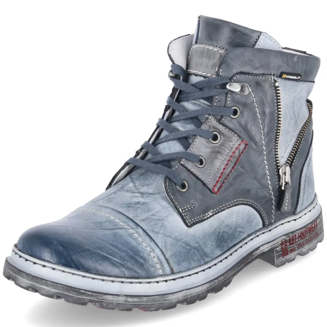 Der Herren-Winterboot von Krisbut verbindet robuste Funktion mit einem souveränen Auftritt. Glattes, langlebiges Echtleder in sattem Blau und eine dezent marmorierte Oberfläche prägen den Look, während der verstärkte Fersen- und Zehenbereich zusätzliche Stabilität gibt. Warmfutter, lederne Decksohle und ein herausnehmbares Fußbett sorgen für ein angenehmes Klima und individuellen Komfort. Die Kombination aus Schnürsenkeln und seitlichem Reißverschluss erleichtert das An- und Ausziehen, unterstützt von Anziehlasche und leicht gepolstertem Einstieg. Mit rund zulaufender Spitze, 3 cm hohem Blockabsatz und flexibler Profilsohle im Used Look eignet sich der Schuh für lange Wintertage in der Stadt. Der Schnitt fällt normal aus und strahlt dank klarer Linien Wertigkeit aus. Modetipp: Zur Raw-Denim, einem grauen Wollmantel und grob gestricktem Schal entsteht ein lässig-eleganter Winterstil, den ein Lederhandschuh in Dunkelblau stimmig abrundet.