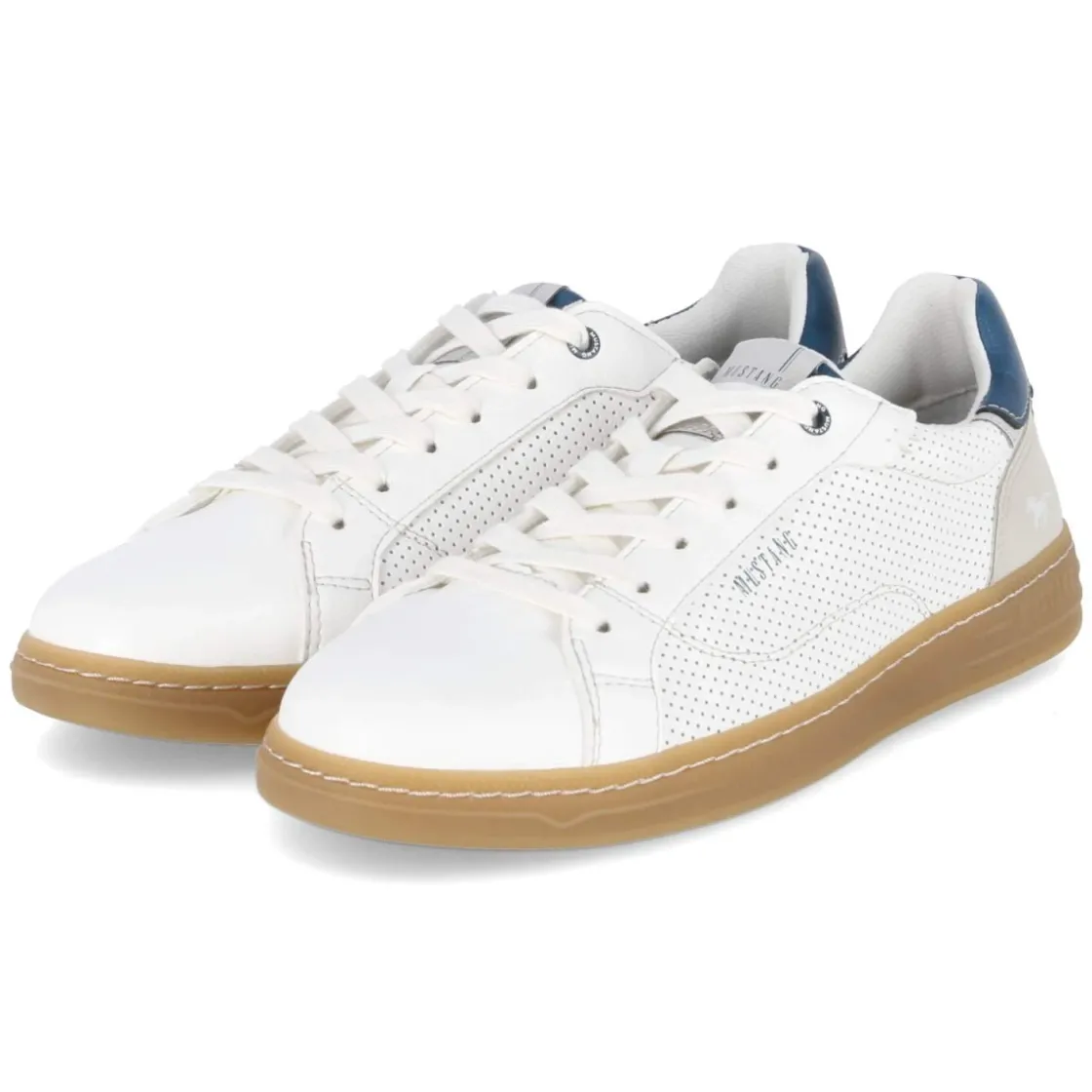 Der weiße Halbschuh von Mustang übersetzt cleanes Design in alltagstauglichen Komfort. Das robuste Obermaterial aus Synthetik präsentiert sich mit fein gelochten Seiten, die für dezente Luftzirkulation sorgen, während blaue und graue Details sportliche Akzente setzen. Eine runde Schuhspitze, die flexible, rutschhemmende Cupsohle und der gepolsterte Einstieg schaffen angenehme Bewegungsfreiheit. Das gepolsterte Fußbett und die textile Decksohle unterstützen ein bequemes Tragegefühl, der verstärkte Fersenbereich erhöht die Stabilität. Dank Schnürsenkeln lässt sich der Sitz präzise justieren, typische Markendetails runden den Look ab. Der Herren-Schuh fällt normal aus und erweist sich mit seiner pflegeleichten Oberfläche als unkomplizierter Begleiter mit vielseitigen Kombinationsmöglichkeiten. Modetipp: Mit heller Chino und einem melierten Strickpullover entsteht ein smarter Casual-Look, der die weißen Nuancen und die farbigen Details harmonisch hervorhebt.