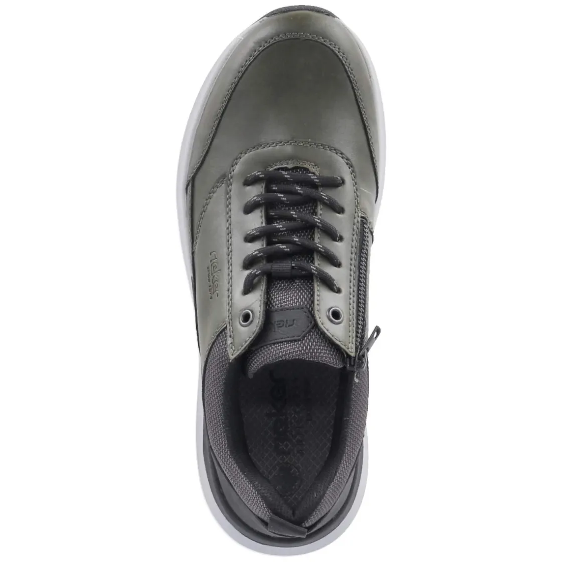 Der Herren-Halbschuh von Rieker in frischem Grün verbindet sportliche Optik mit praxisnahen Details für den Alltag. Das pflegeleichte Synthetik-Obermaterial lässt sich unkompliziert säubern und behält lange seine Form. Schnürsenkel und seitlicher Reißverschluss bieten eine Kombination aus passgenauer Fixierung und schnellem Einstieg, unterstützt von Anziehlasche und gepolstertem Schaftrand. Der runde Leisten schafft Zehenfreiheit, während der verstärkte Fersen- und Zehenbereich Stabilität gibt. Die flexible, griffige Laufsohle sorgt für zuverlässigen Halt auf unterschiedlichen Untergründen und ein dynamisches Abrollen. Innen liegt eine textile Decksohle auf einem gepolsterten, herausnehmbaren Fußbett, das sich bei Bedarf gegen eigene Einlagen tauschen lässt. Passformhinweis: fällt normal aus. Modetipp: mit dunkelgrauer Chino, leichtem Hoodie und Utility-Jacket einen smart-sportiven City-Look setzen.