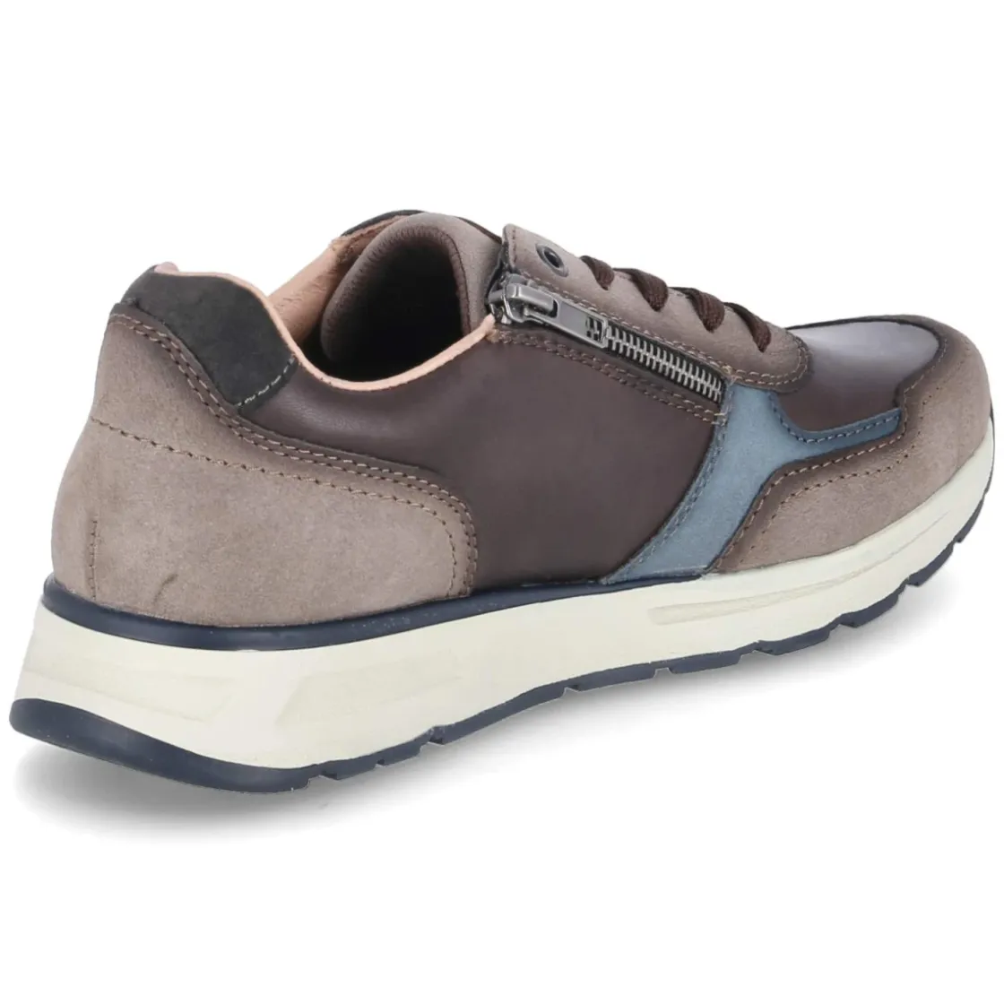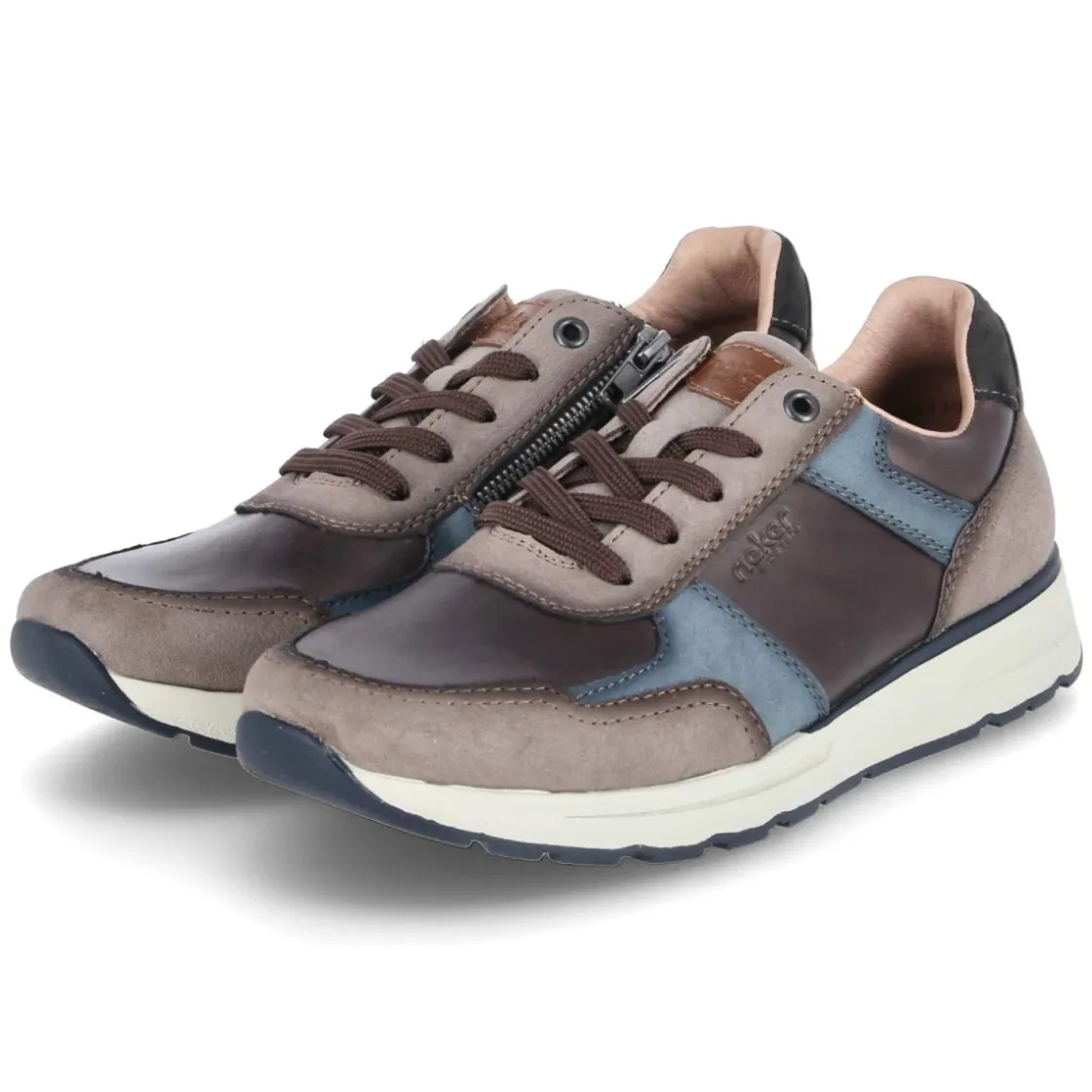 Dieser Low Sneaker von Rieker in warmem Braun verbindet sportliche Linien mit alltagstauglicher Robustheit. Der Material-Mix aus Leder und Synthetik sorgt für eine wertige Haptik und Strapazierfähigkeit, blaue Elemente setzen dezente Akzente. Die runde Schuhspitze und der gepolsterte Einstieg erhöhen den Tragekomfort, die textile Decksohle und das komfortable Wechselfußbett bieten ein angenehmes Fußklima und lassen sich bei Bedarf anpassen. Dank Schnürsenkeln und zusätzlichem Reißverschluss gelingt der Einstieg schnell, die flexible, rutschhemmende Laufsohle gibt sicheren Halt. Verstärkter Zehen- und Fersenbereich und das zurückhaltende Branding runden das Design ab. Der Größenhinweis fällt normal aus und richtet sich an Herren in der Erwachsenengröße. Modetipp: Mit dunkelblauer Chino und naturweißem Henley entsteht ein legerer Look, alternativ mit Raw Denim und Wolljacke in Navy.