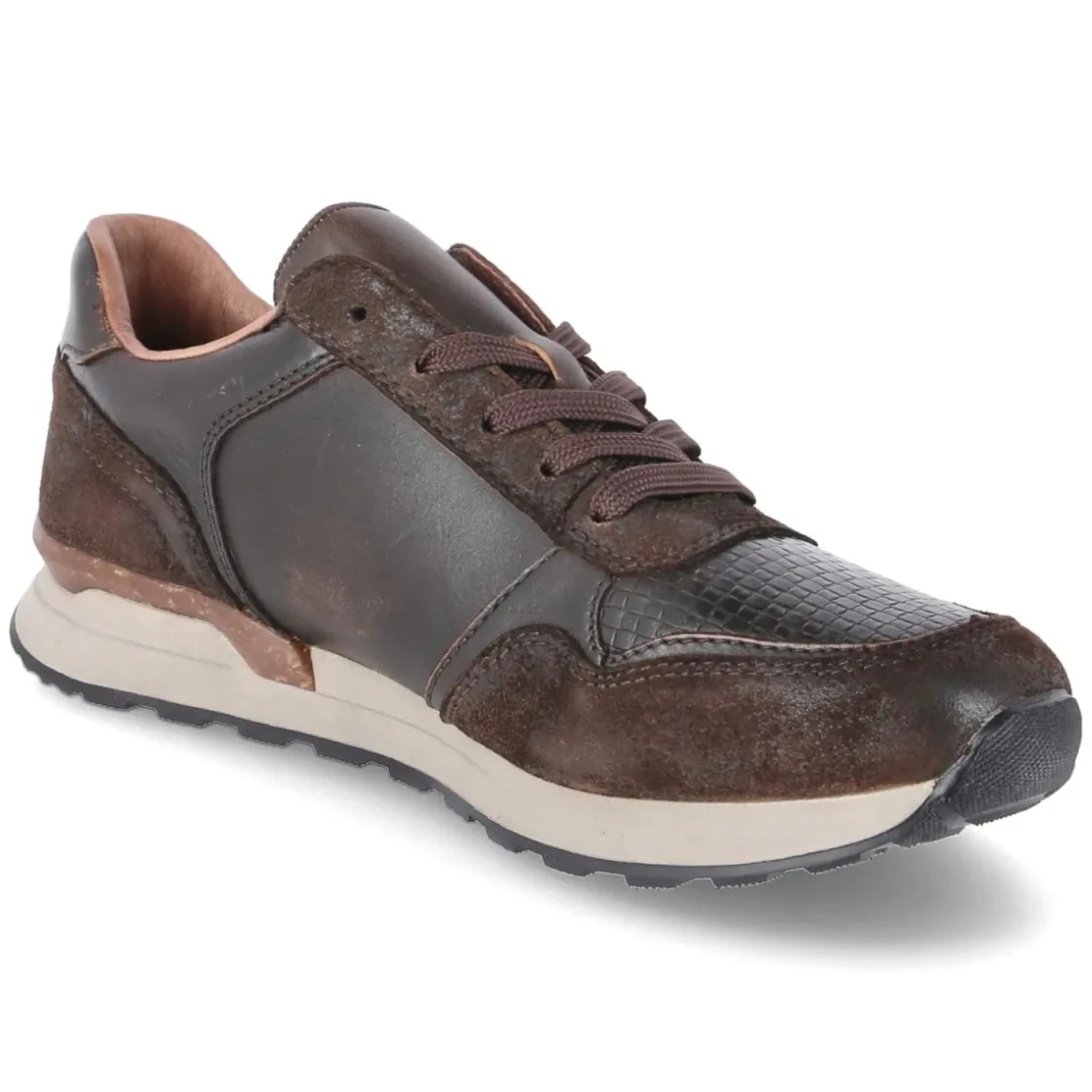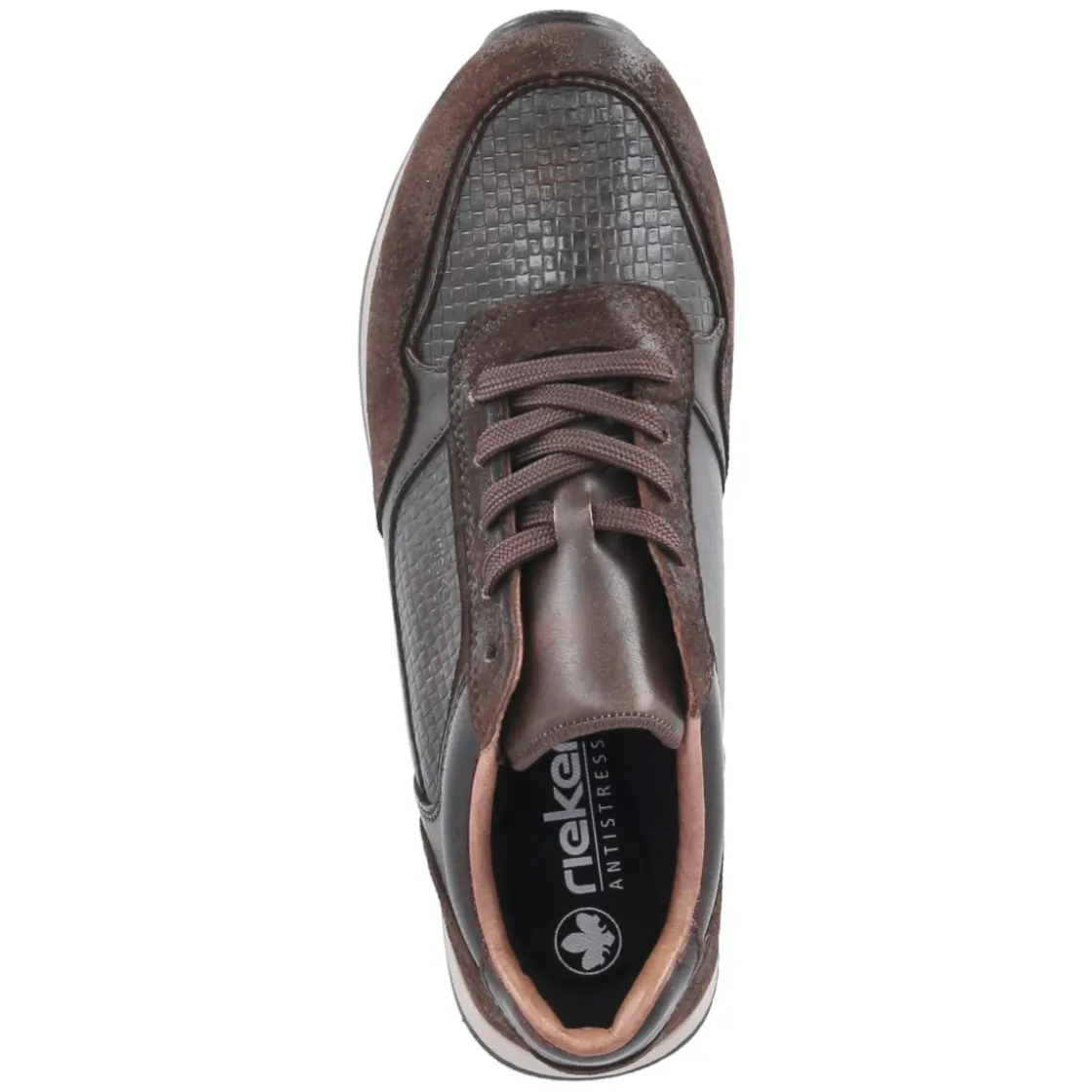 Der Low Sneaker von Rieker zeigt sich in warmem Braun und verbindet markanten Used-Look mit hochwertigem Glattleder. Langlebiges Echtleder und ein verstärkter Fersen- sowie Zehenbereich sorgen für Robustheit im Alltag, während das gepolsterte Fußbett und die Textildecksohle komfortable Schritte unterstützen. Die runde Schuhspitze und der klassische Schnürverschluss verleihen eine zeitlose Silhouette. Dank flexibler, griffiger Laufsohle bleibt der Auftritt sicher und geschmeidig. Das Wechselfußbett ermöglicht individuelle Einlagen, die Passform fällt normal aus. Dezente Partien mit Reptilprägung setzen moderne Akzente und erweitern die guten Kombinationsmöglichkeiten von Denim bis Chino. Modetipp: Ton-in-Ton mit braunem Ledergürtel und Strukturstrick kombinieren, dazu eine gekürzte Slim-Fit-Hose für einen lässig-smarten Auftritt.