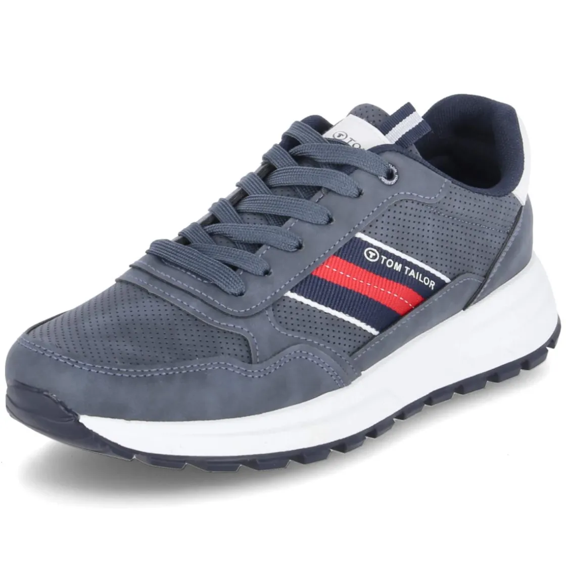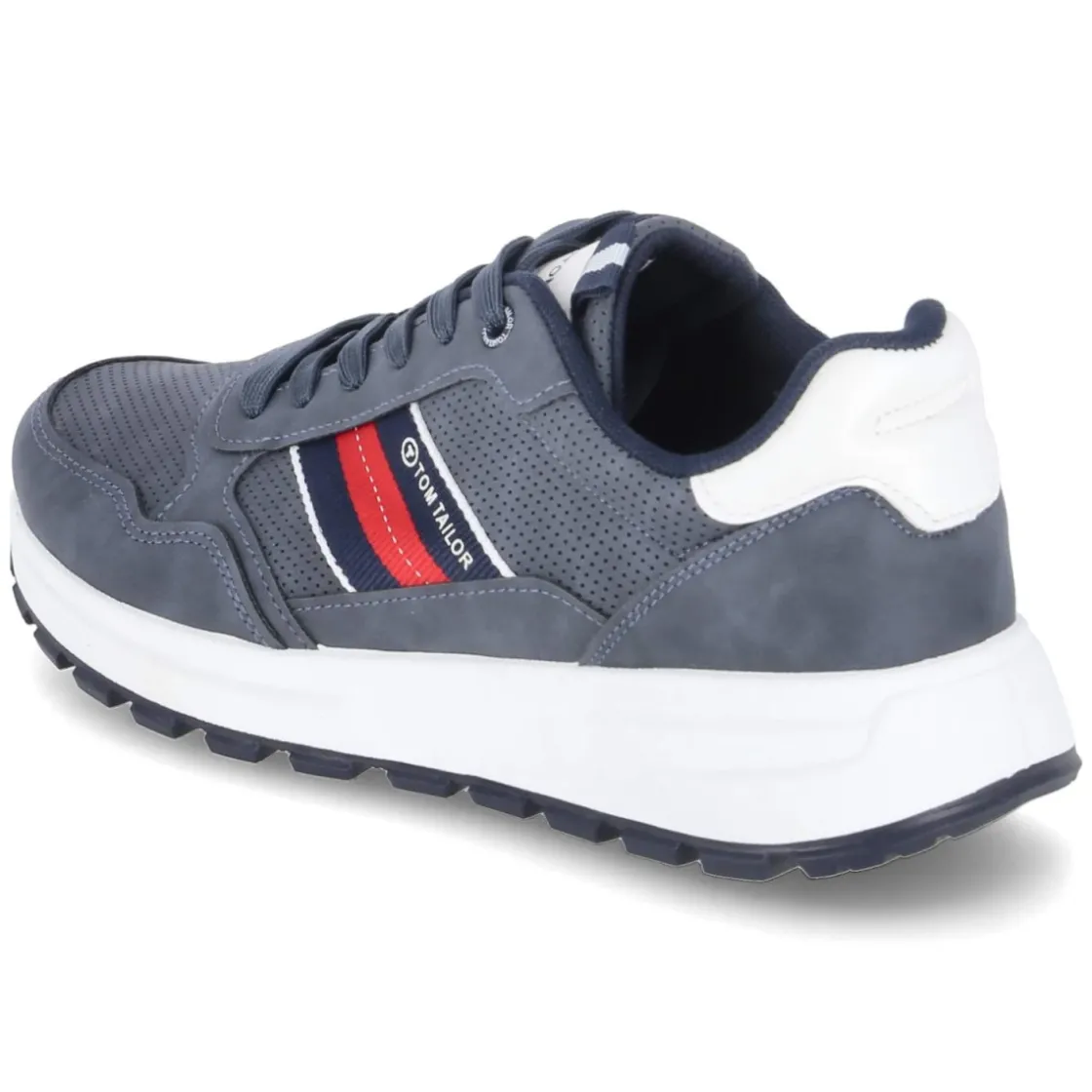 Der Low Sneaker von Tom Tailor bringt sportliche Lässigkeit in die Garderobe erwachsener Herren. Das blaue Modell überzeugt mit pflegeleichter Synthetik-Oberfläche und rund zulaufender Spitze. Feine Perforationen auf Schuhdeck und Seiten sorgen für leichte Belüftung, seitliche Streifen in Markenfarben setzen einen dynamischen Akzent. Für Komfort stehen gepolsterter Einstieg, verstärkter Zehen- und Fersenbereich sowie ein weich gepolstertes, herausnehmbares Wechselfußbett über Textildecksohle. Der klassische Schnürverschluss erlaubt individuellen Halt, die flexible Profilsohle bietet Grip im Alltag. Dank normal ausfallender Größe gelingt die Wahl unkompliziert und macht den Sneaker zum unkomplizierten Begleiter mit vielen Kombinationsmöglichkeiten. Modetipp: besonders stimmig zu heller Chino, gestreiftem Shirt und leichtem Blouson.