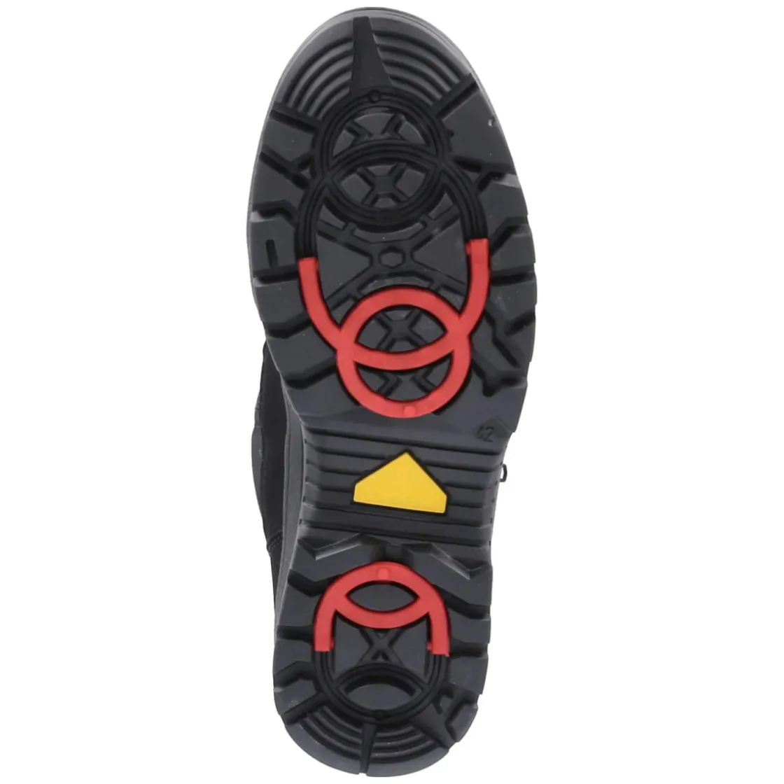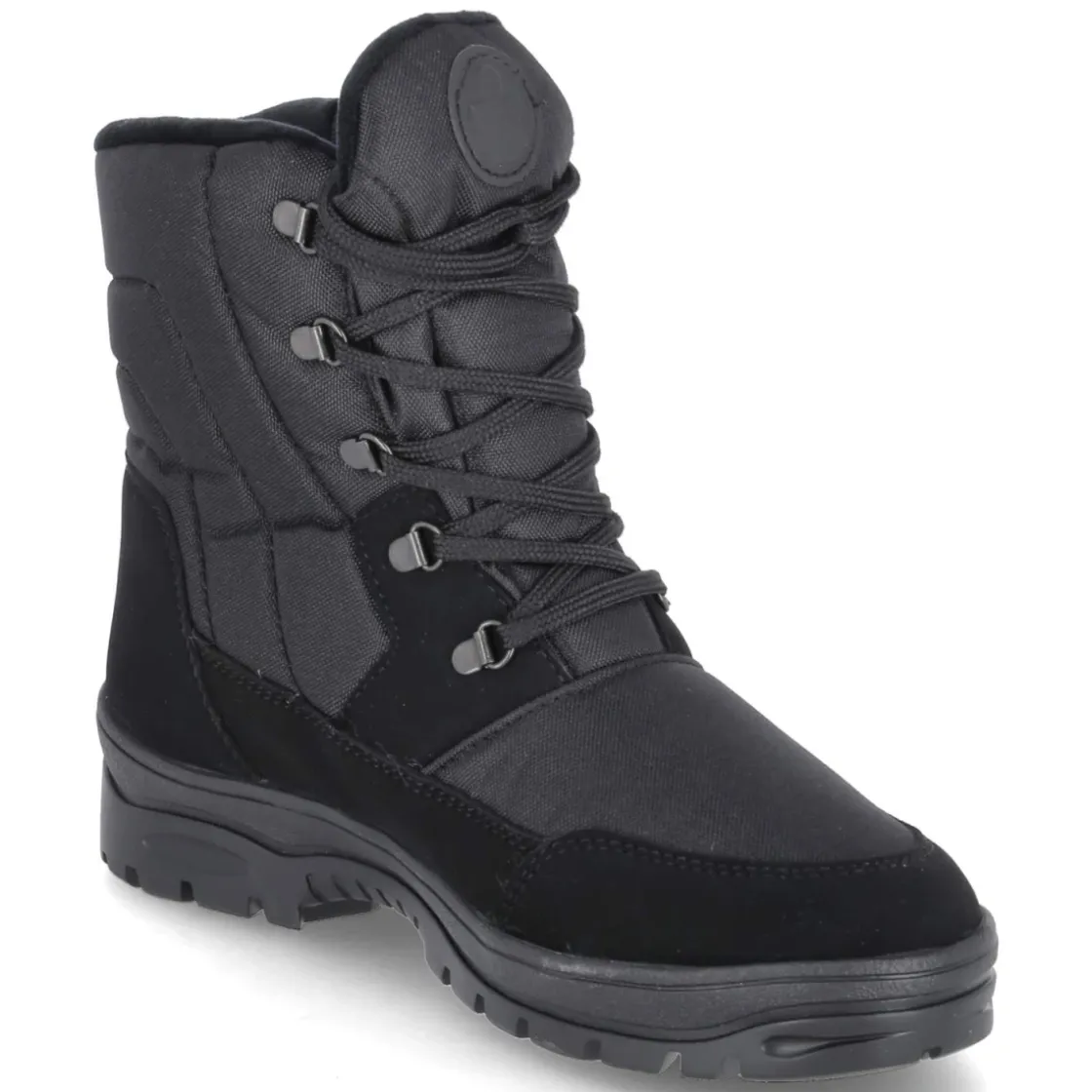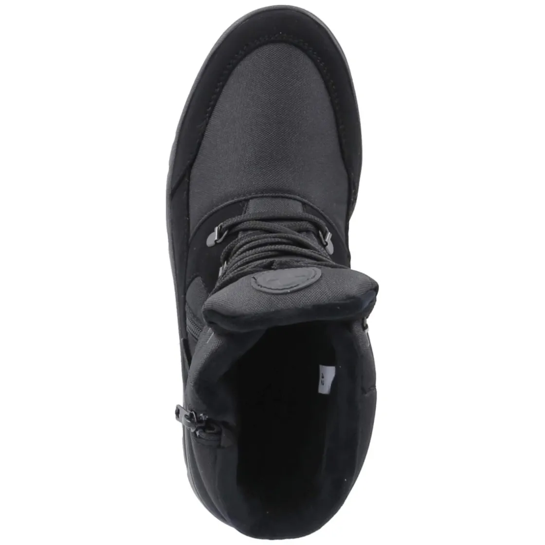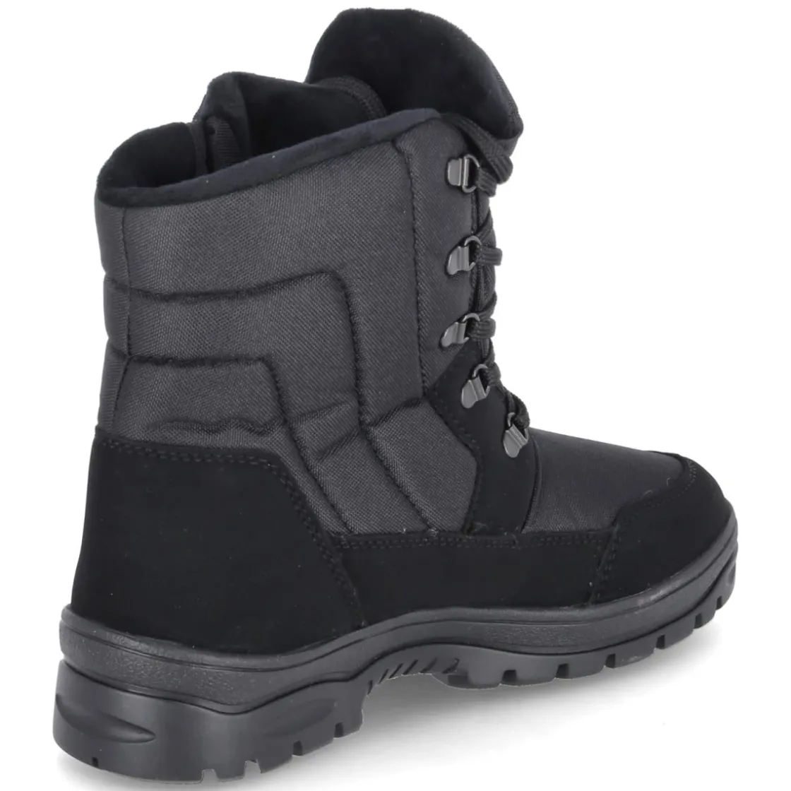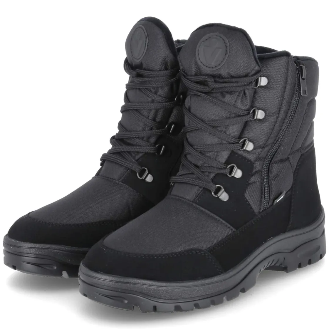 Der Vista Snowboot für Herren setzt auf zuverlässige Performance im Winter. Schwarzes Textil-Obermaterial mit wasserfester Ausrüstung und wasserabweisenden Eigenschaften hält Nässe wirkungsvoll fern, während die atmungsaktive Konstruktion für angenehmes Fußklima sorgt. Das warme Futter umschließt den Fuß weich, unterstützt von gepolstertem Schaft und Textildecksohle. Für sicheren Tritt sorgen die robuste, rutschhemmende Profillaufsohle und das OC-System mit ausklappbaren Spikes, das bei Glätte souveränen Grip liefert. Ein verstärkter Fußrahmen stabilisiert, die Kombination aus Schnürung und bequemem Reißverschluss-Einstieg erleichtert das An- und Ausziehen. Die runde Spitze bietet Zehenfreiheit, die Passform fällt normal aus. Modetipp: In Kombination mit einer technischen Winterjacke und dunklen Cargohosen entsteht ein funktionaler Look, der mit grob gestrickter Beanie stilvoll abgerundet wird.